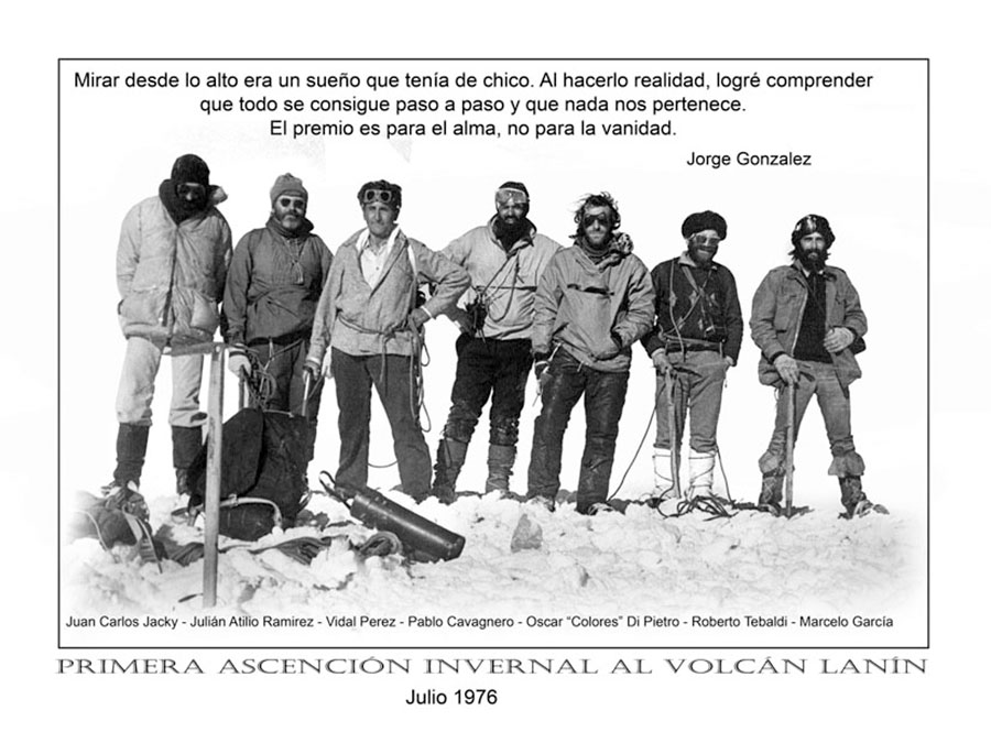 Cuando fuimos a hacer la invernal al Lanín, lo invitamos a participar, cuando llegamos a Junín todo el pueblo estaba a nuestra disposición, hasta habían desalojado una casa de una tía de Vidal para que nos hospedáramos (piso de tierra, catres de cuero de vaca y cocina económica, un lujo). Te adjunto el relato de la invernal, mas no te puedo contar.” De ese relato de aquella ascensión invernal al Lanín en julio de 1976 transcribo: “Fueron sus integrantes: Julián Atilio Ramírez, Roberto Tebaldi, Pablo Cavagnero, Oscar “Colores” De Pietro, Marcelo García, Juan Carlos Jacky, y un invitado muy especial Don Vidal Pérez, poblador de la zona y guía de montaña”.