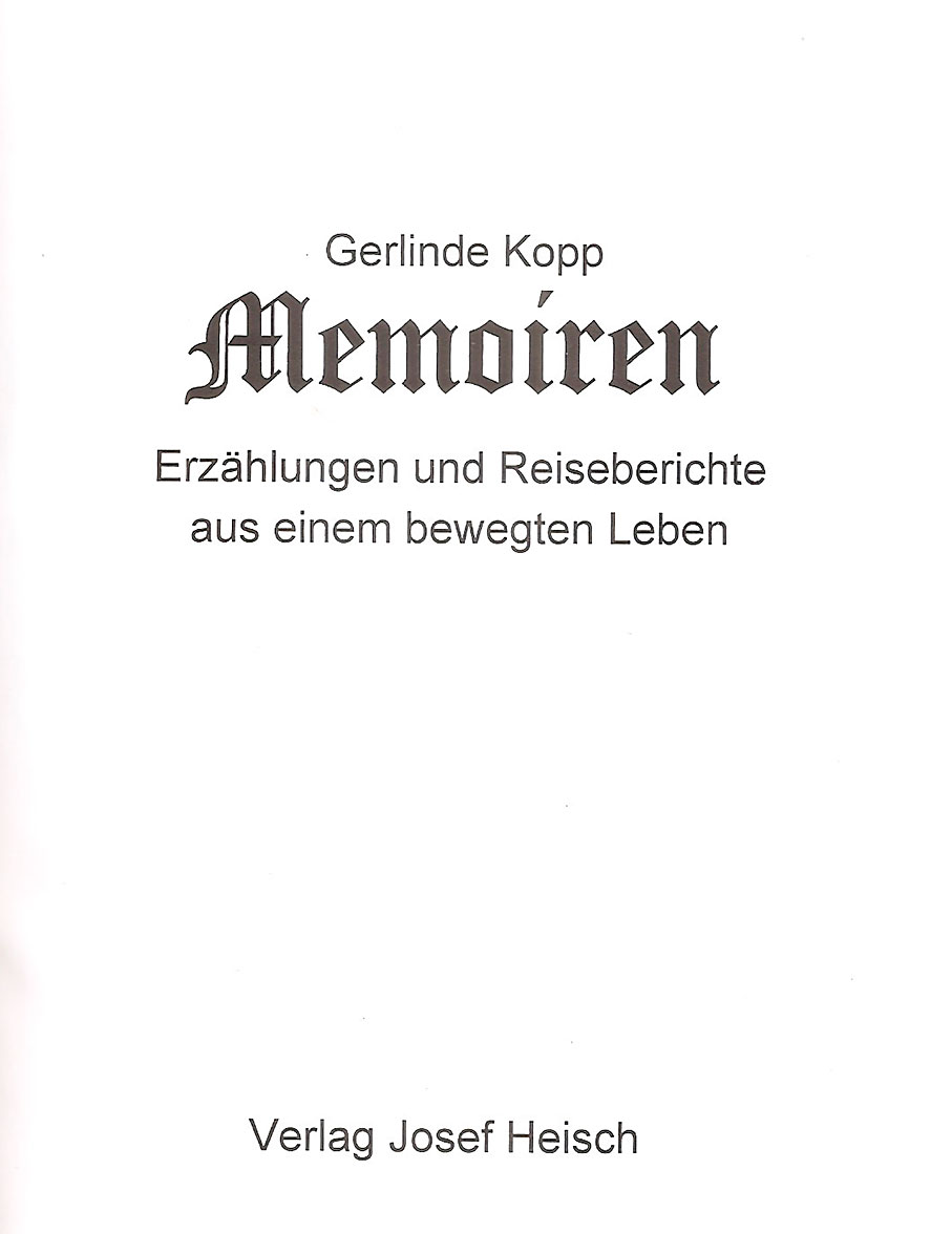 Gerlinde Kopp, en su libro Memoiren, editado en el año 1996, que me fuera enviado el mismo año por la autora, hace una descripción de lo que fue su vida tanto en su familia, como así también cuando contrajo matrimonio y su vida compartida con Thomas Kopp, y gracias al ayuda del doctor Peter Thomas, de la Universidad Nacional de Cuyo, quien tradujo varios datos del libro de Gerlinde, podemos transcribir algunos datos interesantes de esos años: Gerlinde, era una niña tierna y esta cualidad la traslado a su descripción del libro. Ella, recordaba los años felices a pesar de las necesidades que tenían en Oñate, lugar donde nació. Recordemos también, que luego de la Primera Guerra Mundial, la vida en Alemania, era muy difícil por las carencias de todo tipo que tenía toda la población, fue el motivo por el cual, sus padres emigraron a Oñate, España.