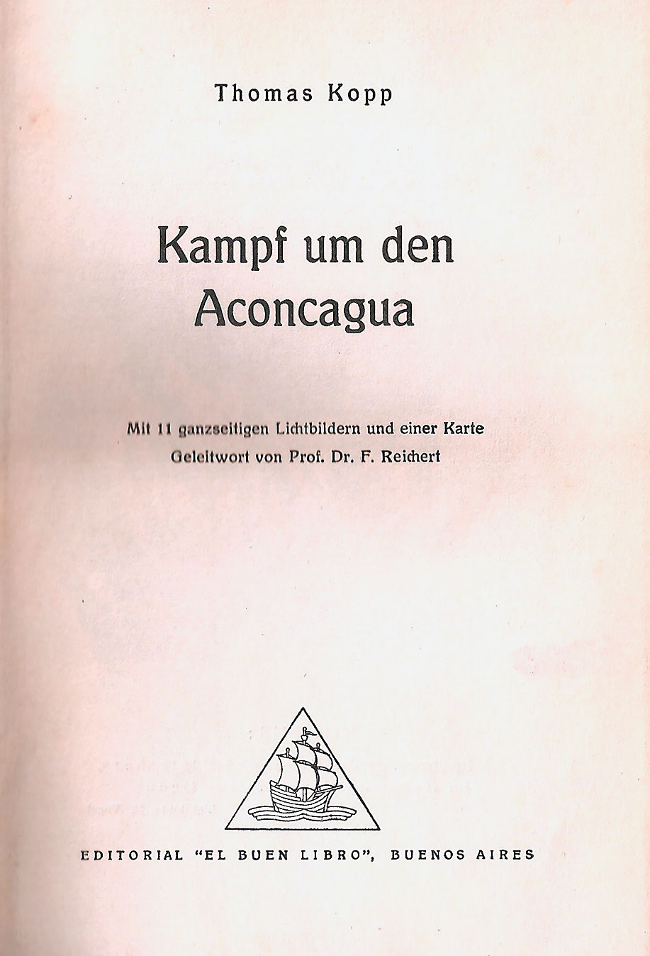 En el año 1946, Thomas Kopp, junto a dos compañeros subió la cumbre Norte del cerro Aconcagua, siempre seguía sus pasos por los datos que en cada carta me enviaba. Para el año siguiente, planificaron algo grande, subir la cima Sur del cerro, aún inviolada; con la conquista de la misma, en el año 1947, escribió un libro que tituló “50 años de lucha en el Aconcagua”, el cual le propuse traducirlo, pero nunca lo hice. Este compromiso, que describe en su libro “Memoiren” (que traducido al castellano, significa: Memoria), no lo llegó a ver Thomás, pero sí yo, que en su oportunidad le pedí que lo tradujera, luego de algunas misivas cursadas, me dijo que lo haría y así fue, lo realizó y me hizo llegar sus copias por carta.
