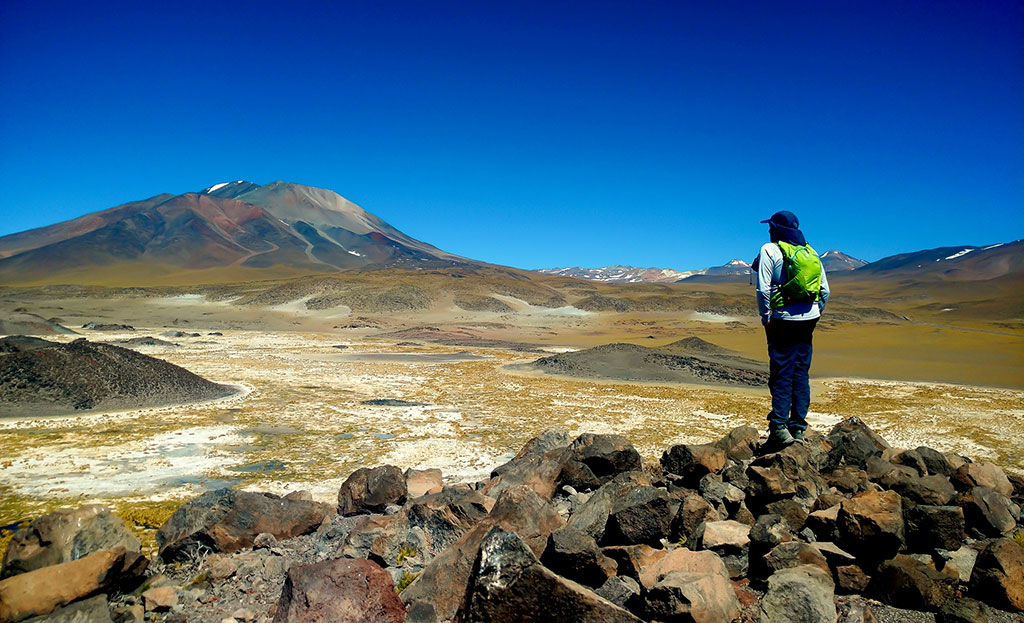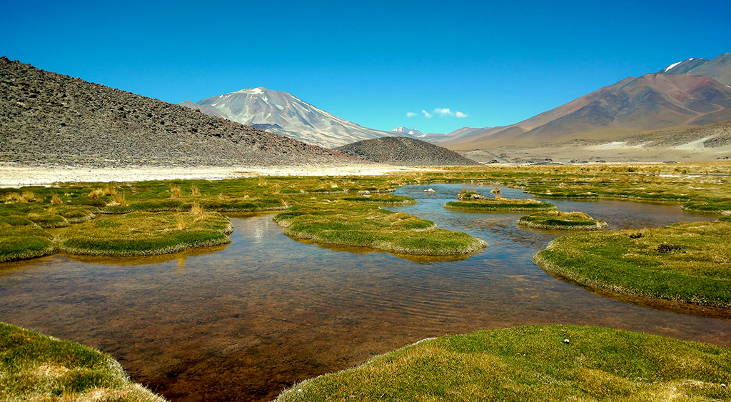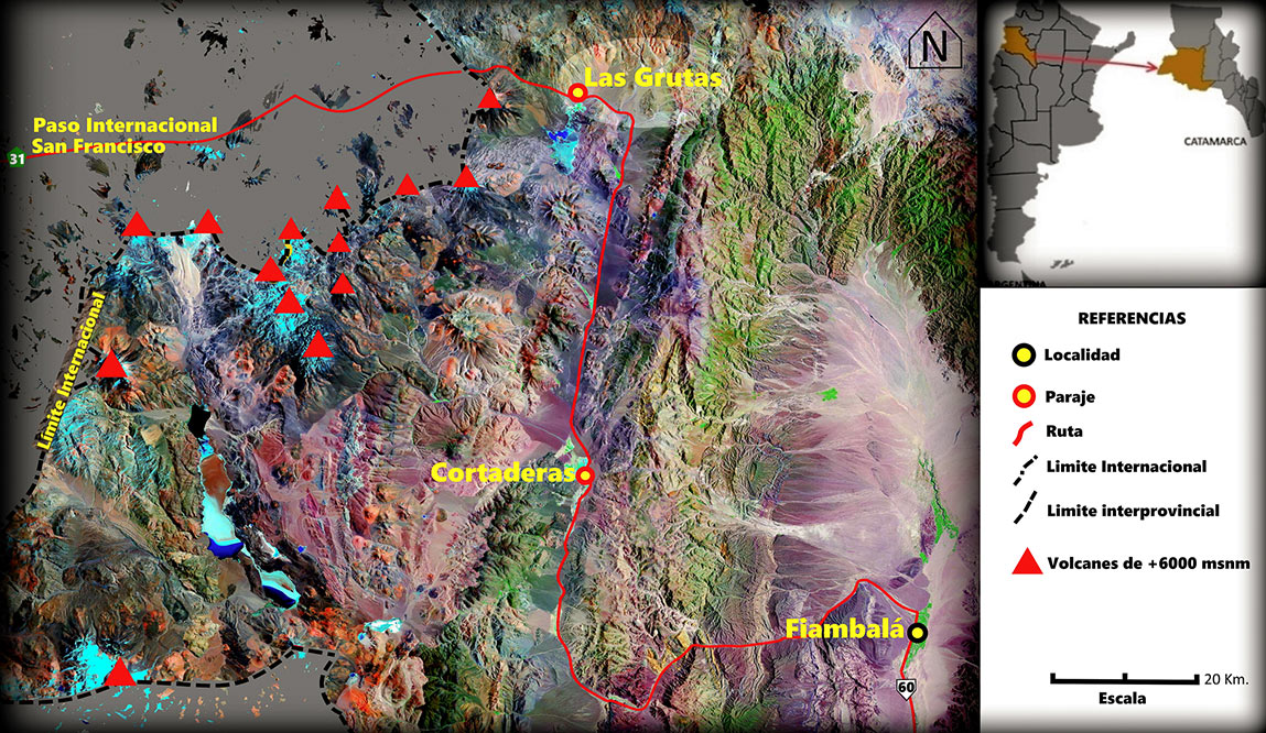 Durante el trayecto sobre la RN 60 para acceder a Las Grutas las altitudes menores se encuentran hacia el este y comienzan a ascender paulatinamente hacia el oeste. A medida que el camino se introduce en este paisaje de cordones alineados, volcanes y grandes planicies, el escenario nos brinda una vista privilegiada del “Campo Volcánico más alto del Mundo” y algunas de las cumbres más elevadas de América como el Volcán Ojos del Salado (6893 msnm), Walther Penck (6658 msnm), Incahuasi (6638 msnm), Muerto (6505 msnm) y otros.