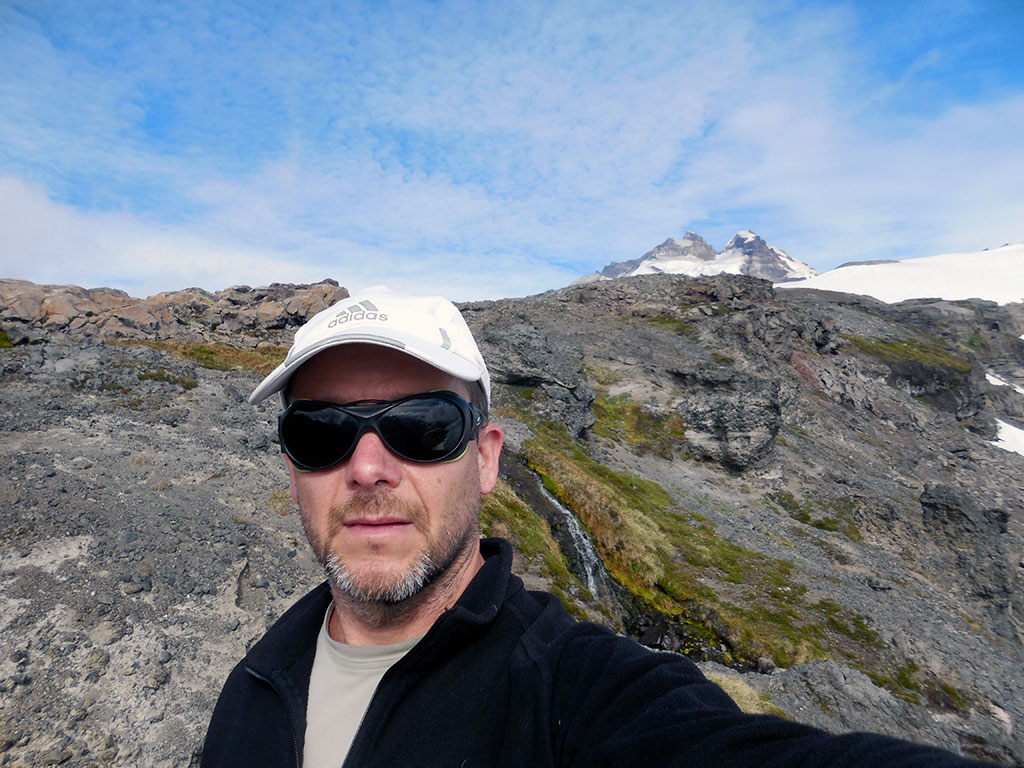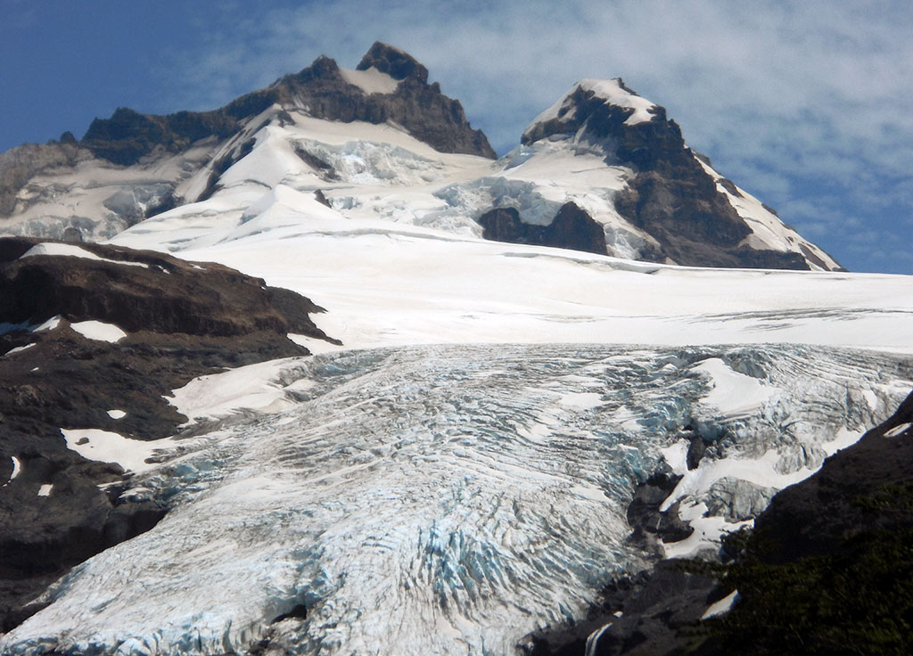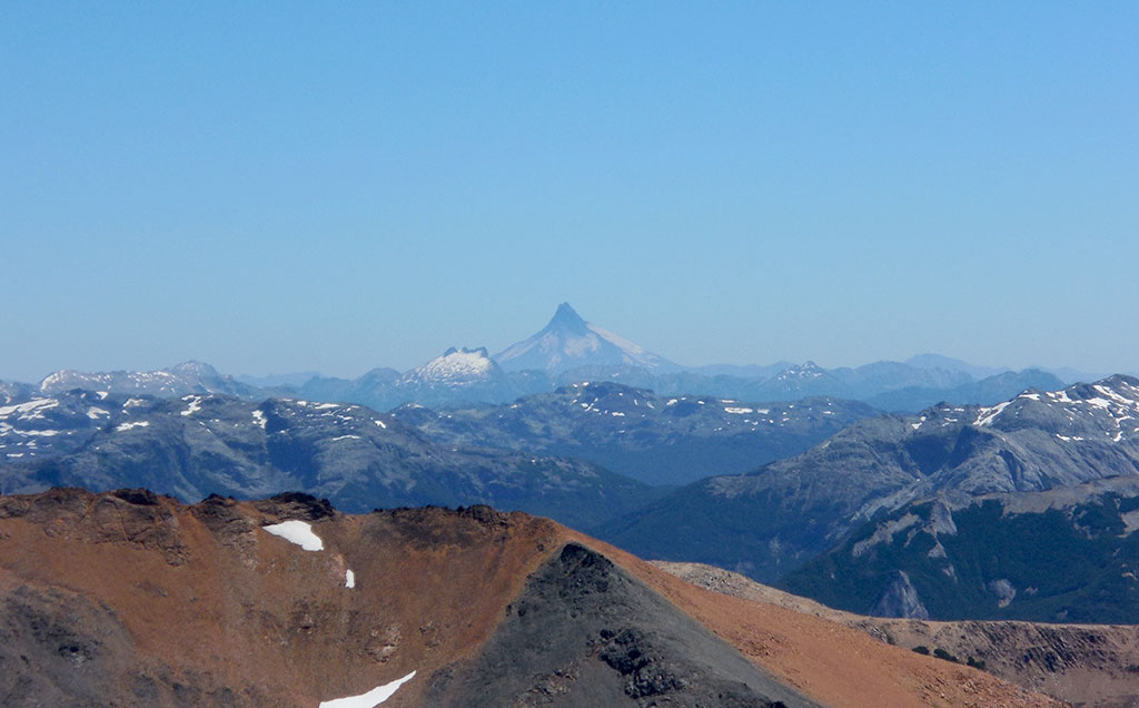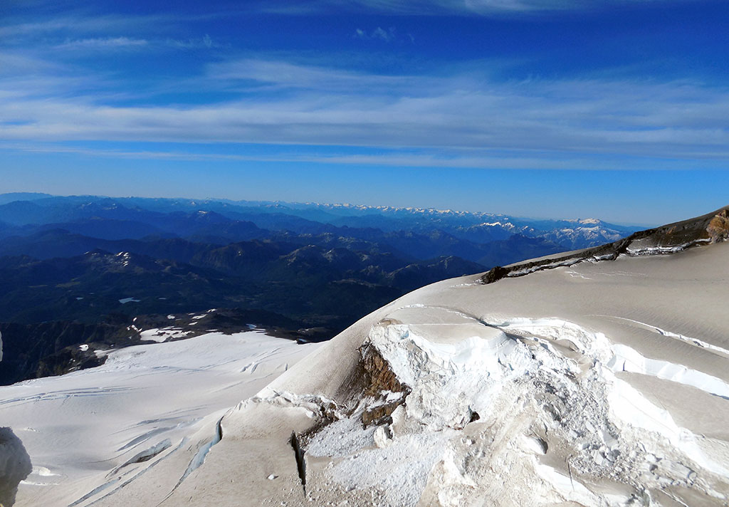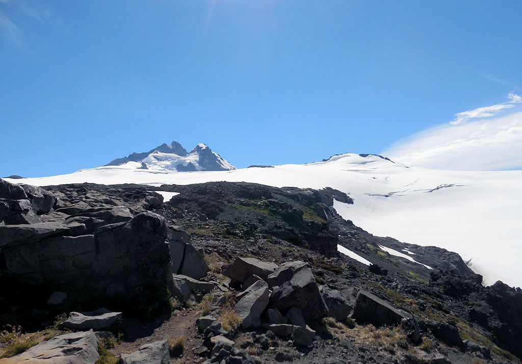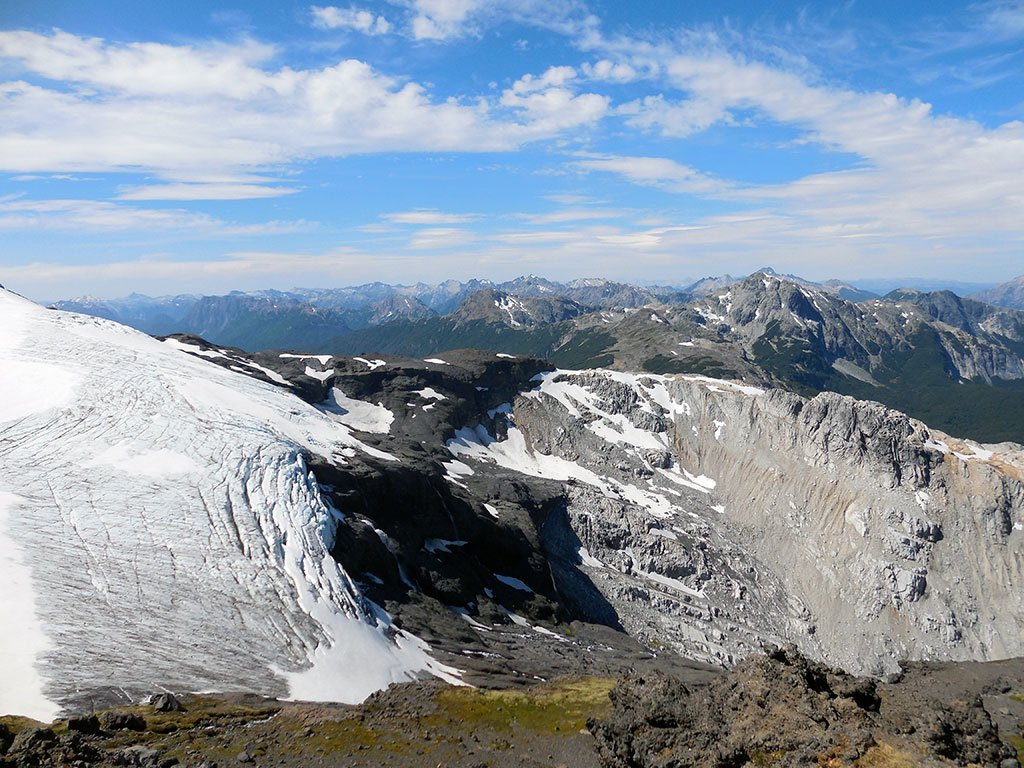 Y di el último paso que me puso en la cumbre del pico argentino del cerro Tronador. La emoción y la alegría fueron completas. La vista desde la cumbre es hermosa. Se pueden ver infinidad de montañas, tanto del lado argentino como del lado chileno. El día estaba despejado y muy claro, se sentía el aire frío en la cara y en las manos. Eran las 8:40 de la mañana. Dante me confirmaba que habíamos hecho muy buen tiempo, 4 horas y 40 minutos, cuando por lo general se demora entre cinco y siete horas. Verdaderamente, había resultado todo perfecto. El tiempo había acompañado, el estado de la nieve era óptimo y no había surgido ningún inconveniente. Como estábamos con tiempo, pasamos un rato en la cumbre, comimos algo y charlamos. Nos dimos cuenta lo afortunados que éramos de poder estar ahí.