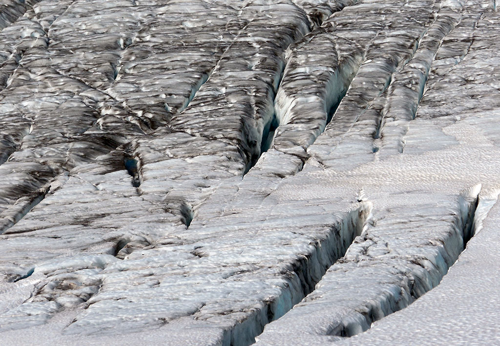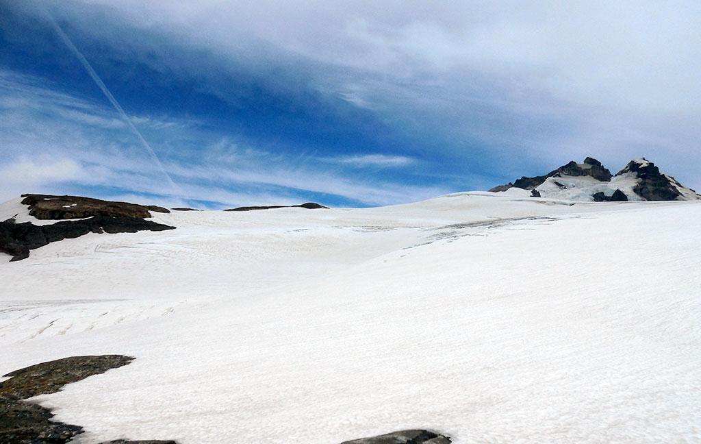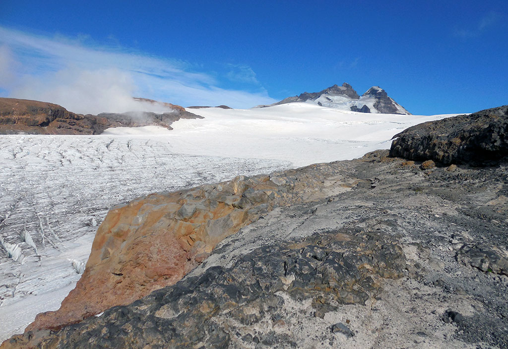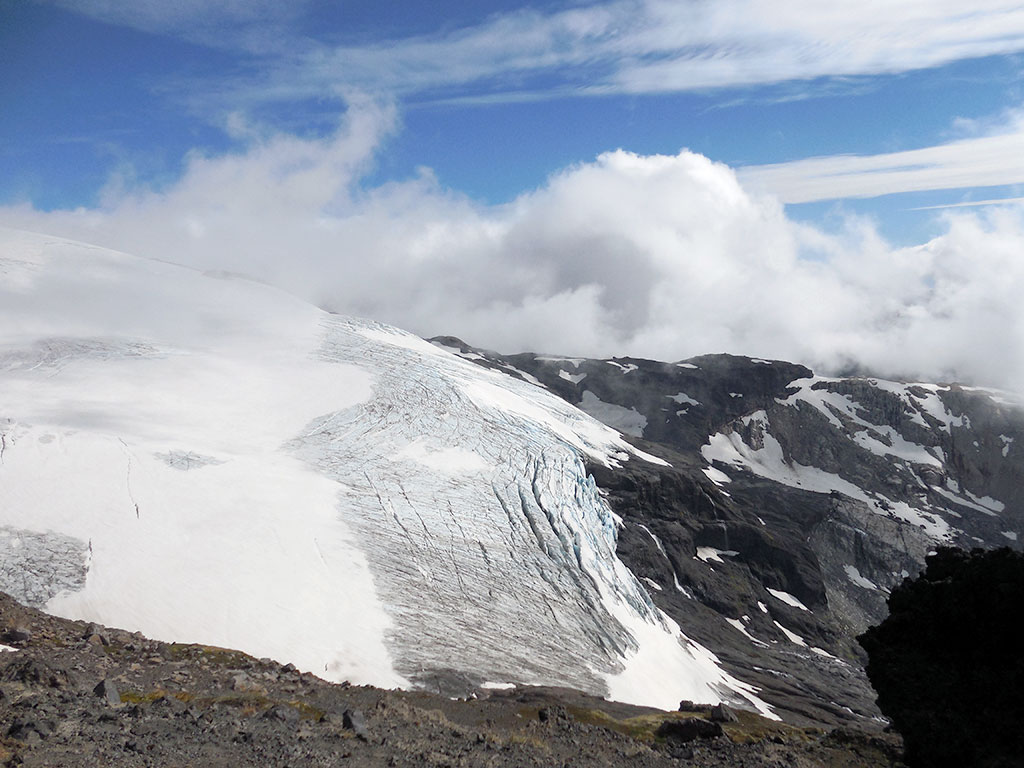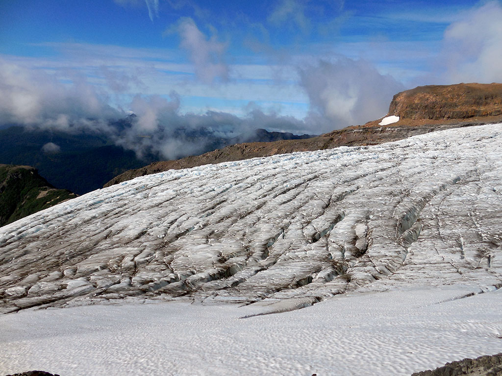 Terminando el descenso del Filo de la Vieja, descansamos unos minutos, aprovechamos para hidratar nuevamente y comer chocolate y algunos frutos secos. Como una vez escuché decir a un montañista de mucha experiencia: “las tres leyes básicas de la montaña son, beber antes de sentir sed, comer antes de sentir hambre y abrigarse antes de sentir frío”. Actuamos en concordancia. En ese momento, gracias al sol, todo se había tornado de un amarillo anaranjado que no había visto nunca antes. Nuevamente, el cerro Tronador y su entorno, me volvían a sorprender y emocionar. Seguimos avanzando y la pendiente comenzó a ser un poco más pronunciada. Aparecieron grietas bien visibles que nos obligaron a rodearlas y tener que hacer varios zigzags. Nuestro próximo destino, era col entre el pico argentino y el pico internacional. Pero antes de que llegáramos, sentí un olor muy particular, pero concentrado en la marcha, no pude identificar de qué se trataba. Luego, Dante me explicaría que era el azufre emitido en algún momento por el volcán.