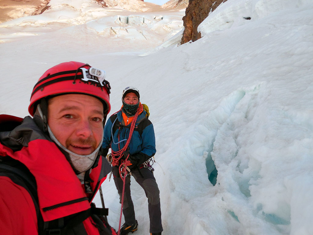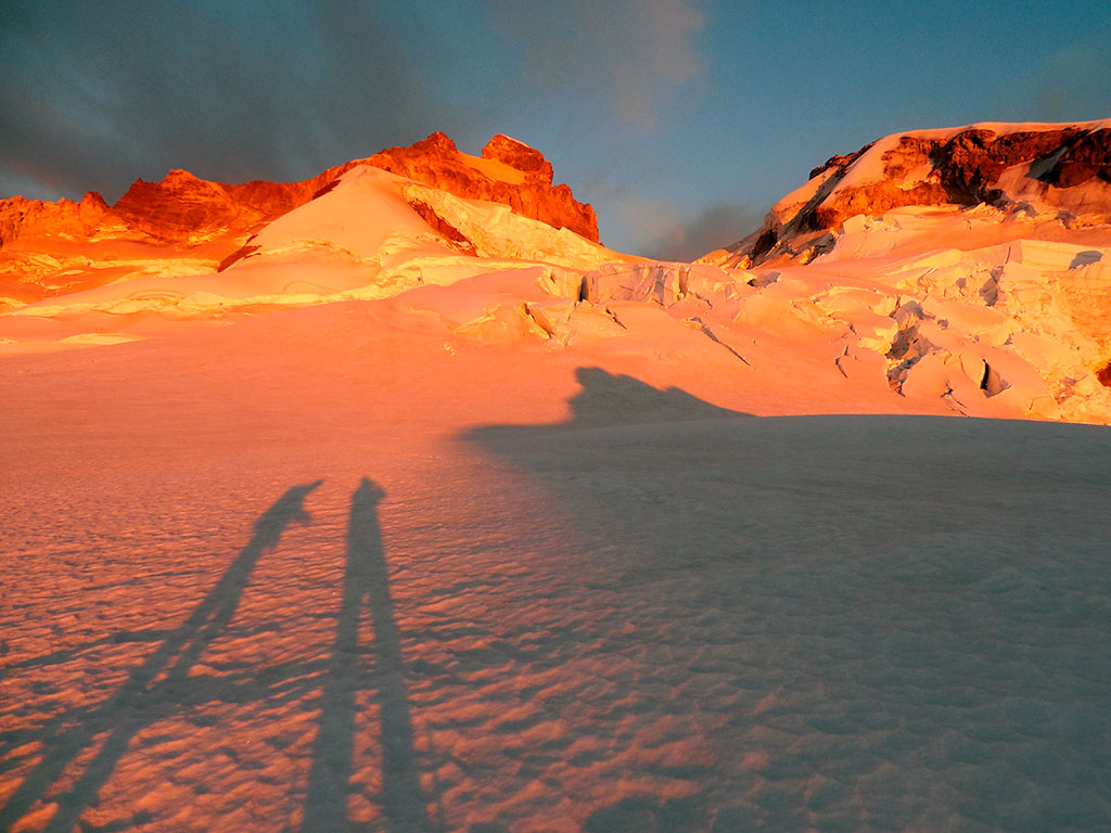 Con Dante íbamos llegando al Filo de la Vieja mientras el sol despuntaba. Ya podíamos seguir sin la luz de las linternas frontales. La sensación era buena. Las piernas levemente cansadas, pero mucho mejor de lo que esperaba. Por más entrenamiento físico que hubiese realizado, no estaba (y no estoy) acostumbrado a caminar con botas y crampones. Hasta ese momento la caminata había sido relativamente sencilla. La mayor parte del trayecto tenía una pendiente leve a moderada que se podría transitar cómodamente. El hecho de salir temprano, fue determinante para poder aprovechar la dureza de la nieve. Para maximizar la seguridad, es muy importante que la nieve estuviera en esas condiciones, ya que no cansa tanto caminar y, sobre todo, los puentes de nieve de las grietas soportarían el peso de nosotros al cruzar.