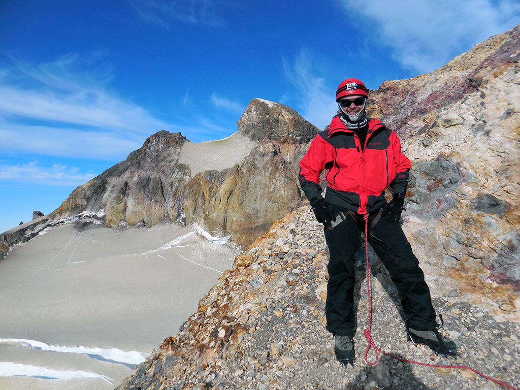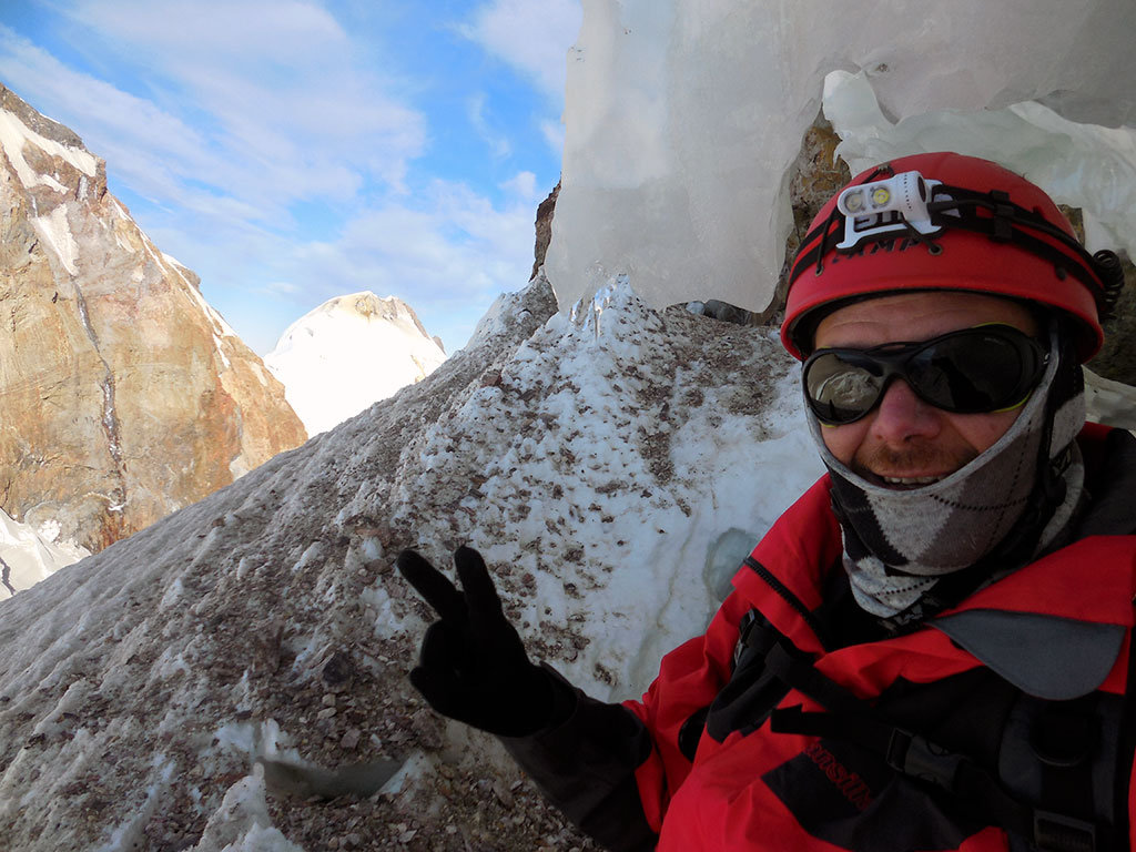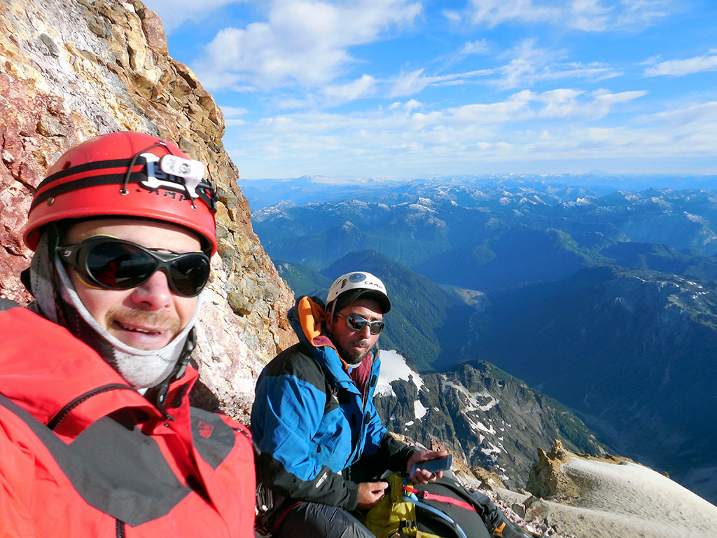 Una vez en el col entre el pico argentino y el pico internacional, dejamos los bastones de trekking y encaramos la parte más técnica con crampones y piqueta. La cumbre estaba ya muy cerca, la emoción se palpitaba, pero faltaba superar las últimas dificultades. Ese último tramo se trata de una pendiente, de nieve dura, de unos 300 metros que tiene una inclinación de unos 45 o 50 grados. Luego, hay un paso bastante expuesto que permite acceder a unos 2 o 3 metros de escalada en roca que es bastante simple, pero dada la altura a la que estábamos (3 mil metros snm), se torna más difícil. En este momento, el cansancio en las piernas ya era más notable, y ver la pendiente que había por delante, inspiraba respeto. Pero no había alternativa, descansamos unos minutos, y encaramos la cuesta con paso tranquilo pero firme. Poco a poco, y con descansos intercalados, fuimos acercándonos a la zona donde haríamos una reunión con los tornillos, los mosquetones y la cinta. Una vez asegurados, Dante atravesó el paso más expuesto y llegó a la cumbre. Desde ahí me dio seguro para que yo hiciera lo mismo. En ese momento ya no sentía cansancio, creo que la adrenalina y la emoción de estar tan cerca, hizo que me olvidara de todo. Y por fin encaré el último tramo de 2 o 3 metros que me separaban de la cumbre, momento en el cual me di cuenta que nunca había tenido que usar los crampones para escalar en roca.