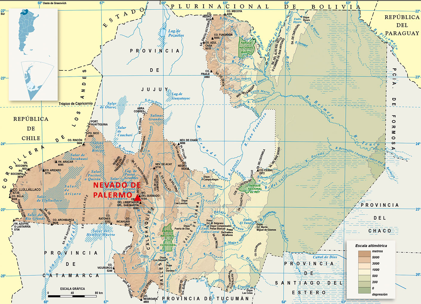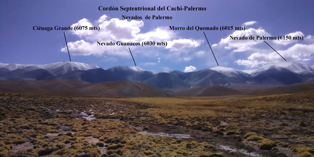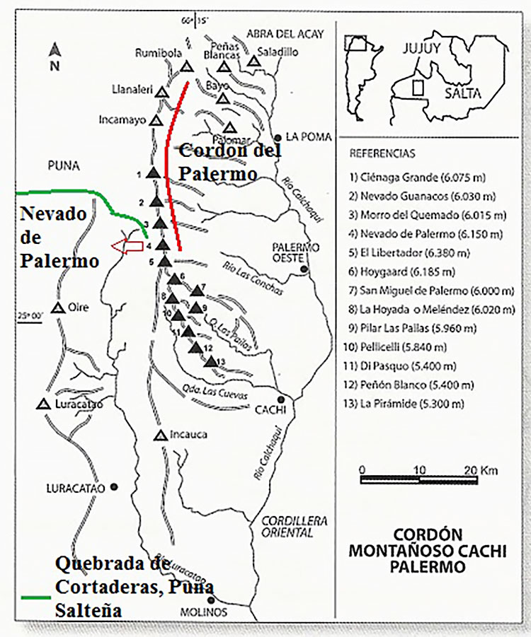 La figura que se destacaba en este cordón la exponía el Cachi (Libertador Gral. San Martín, 6380 mts), pero sin lugar a dudas nos topamos con uno de los primeros filtros: su accesibilidad. Para llegar al Cachi por la Puna, nos demandaba mucha logística y sobre todo tiempo. Si bien, era una opción muy interesante ya que este pico no contaba con varios ascensos por el oeste, era ideal recrear un ascenso histórico que alguna vez tuvo. Pero la variable logística pesó más a la hora de decidir y por lo tanto debimos reorientar nuestra mirada hacia el norte del Cachi; específicamente al Cordón del Palermo. Fue así entonces que surgió el interés como primera gran opción, hacer el Nevado de Palermo (6150 mts) por la Puna.