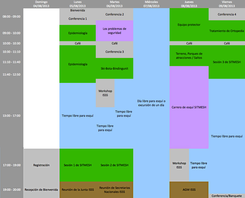 En la actualidad el temario incluye epidemiología en lesiones y reporte de casos, tratamiento de lesiones en deportes de nieve, diseño y testeo de nuevos equipamientos (por ejemplo construcción de fijaciones y esquíes), evaluación de equipos de protección (como cascos y protecciones articulares), campañas para prevención de lesiones, el rol de la instrucción del ski y snowboard y temáticas de áreas de ski, entre otros tópicos.
