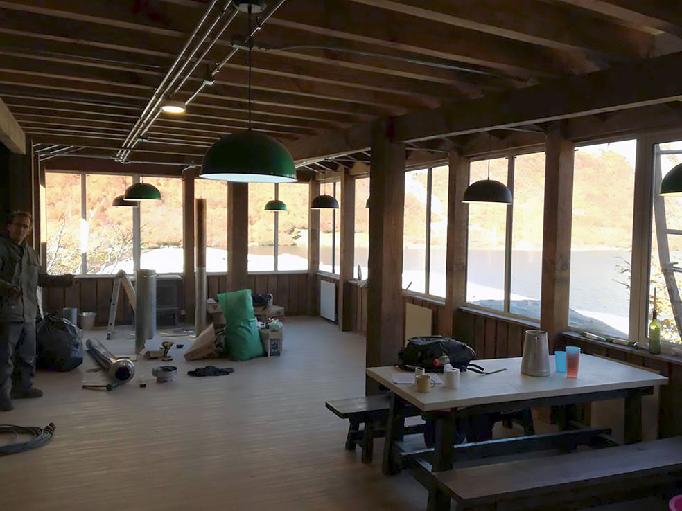 El edificio tiene unos ventanales privilegiados al lago. El calor de las estufas a leña invita a sentarse y contemplar el magnífico paisaje otoñal. El nuevo Refugio Jacob es un lugar de belleza inusual al cual todos estamos invitados.
