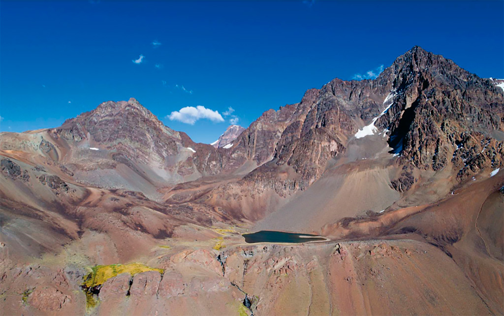 El Aconcagua es una mole de roca que ha emergido merced a choques de placas tectonicas que la elevaron desde las profundidades, hasta quedar exhibida como una joya y un atrlbuto regional, un diamante.