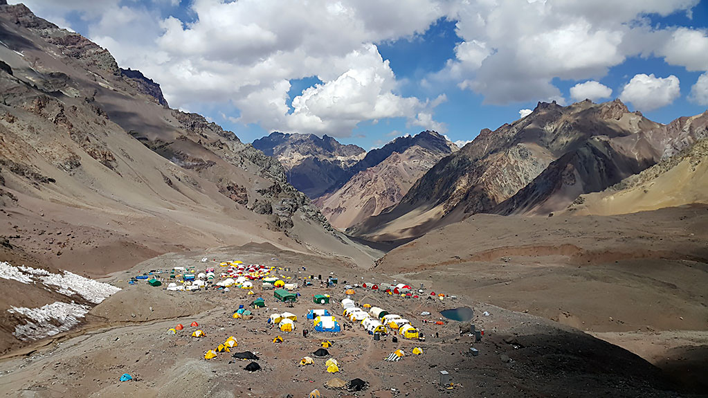 Nos comenta que básicamente un día típico en el Servicio Médico en Plaza de Mulas, su campamento actual, se divide entre los controles médicos y hacer el seguimiento de montañistas que se encuentren con algún problema y que hay que re-evaluar. También caminar por el campamento e ir viendo cosas que quizás no se han visto en una primera instancia en el consultorio, poder hacer un trabajo más de campo, con todas las eventuales evacuaciones que se puedan presentar, que en esta montaña en particular se realizan en helicóptero.