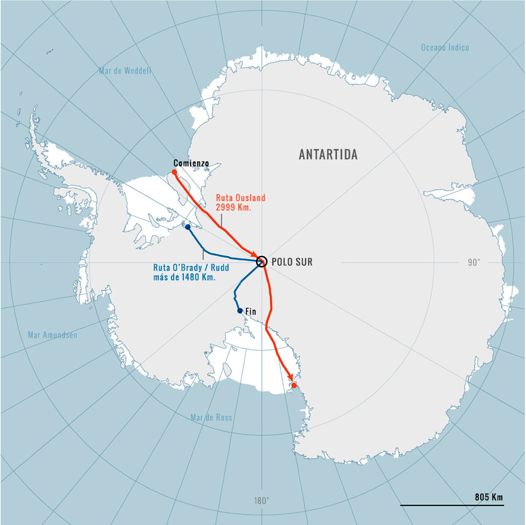 En la última semana de su peligrosa travesía, el estadounidense O'Brady y el ingles Louis Rudd, capitán del ejército británico de 49 años que intentaba lograr el mismo récord, se enfrentaron a sensaciones térmicas y condiciones de visibilidad cero potencialmente mortales. Mientras sus cuerpos adelgazaban por el esfuerzo —Rudd estima que ha perdido más de 12 centímetros de cintura, que ya es delgada de por sí—, avanzaban 13 horas al día en un frenético mundo blanco y congelado. A menudo, la visibilidad era tan mala que no podían ver el suelo que pisaban. Si esto parece difícil, es porque lo es. El trineo de Rudd pesaba 150 kilos, el de O’Brady, 170. Tras un mes y medio esquiando y acampando a temperaturas bajo cero, Rudd declaró en su actualización diaria: «Dios mío, ahora mismo hace un frío brutal».