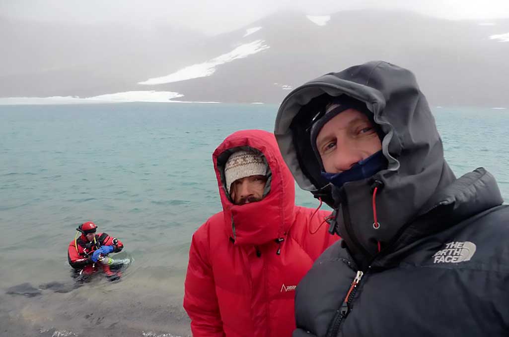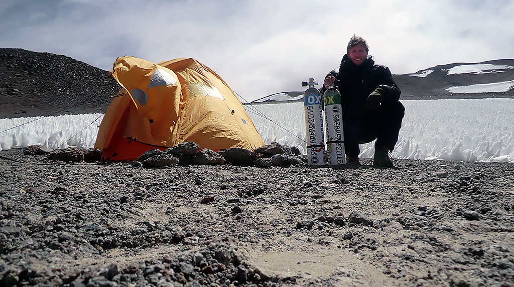 Marcel tiene que estar 12 hs antes del buceo a la misma altitud así que hay que armar la carpa a orillas de la laguna el día anterior para dormir allí y además servirá de refugio para calentarse apenas salga del agua.