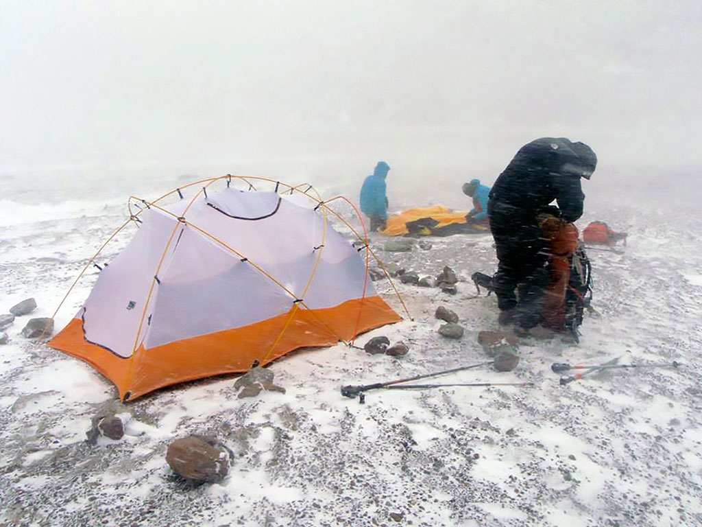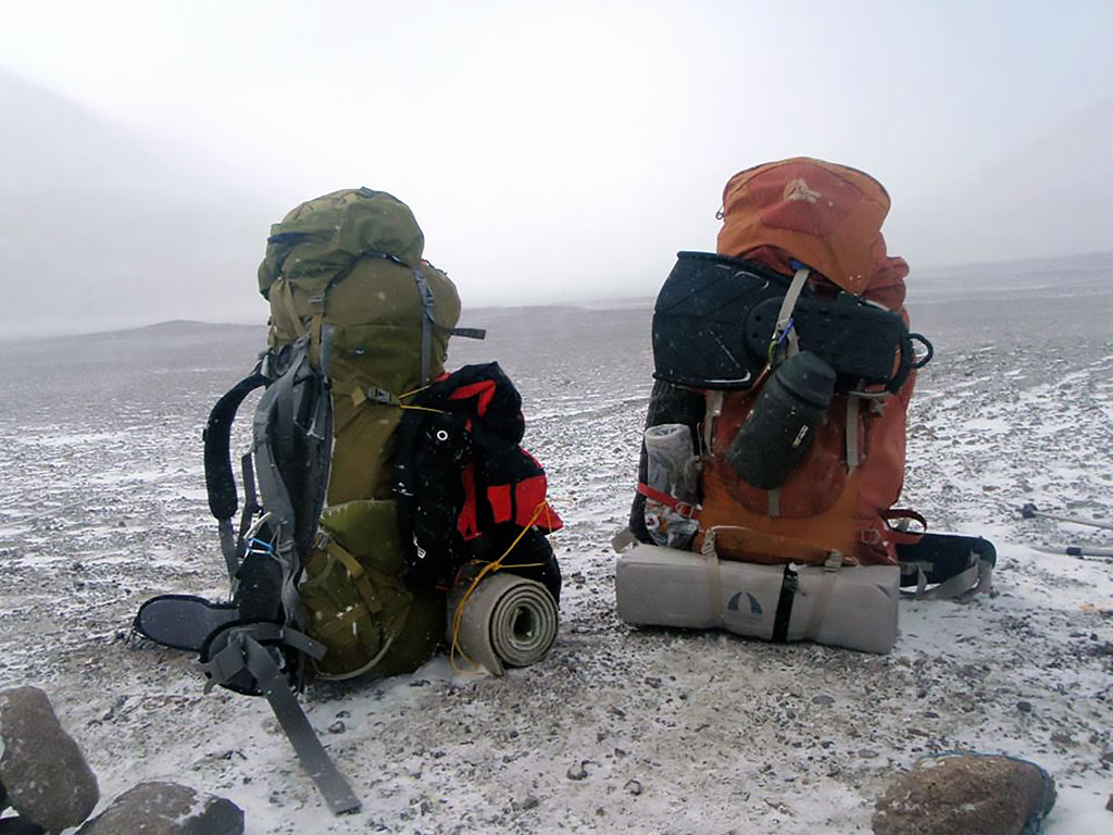 Amanece con mucho viento, abro la puerta de la carpa y veo como todo está blanco, el viento viene cargado de nieve en forma horizontal y dificulta la visión, es el famoso viento blanco de Los Andes que nos da la despedida de la montaña, tenemos que organizarnos para salir ya que estamos muy cargados porque además del equipo de montaña tenemos que cargar todo el equipo de buceo y la mochila nos queda chica, haciendo malabares logramos armar la carga en medio de la tormenta, con los dedos congelados desarmamos por último las carpas y las ponemos como podemos en la mochila, hay que bajar como sea, salimos disparados hacia el CB, el viento nos empuja y la nieve nos golpea por todos lados pero vamos bien y en unas 3 hs estamos en el base donde nos espera la 4x4.