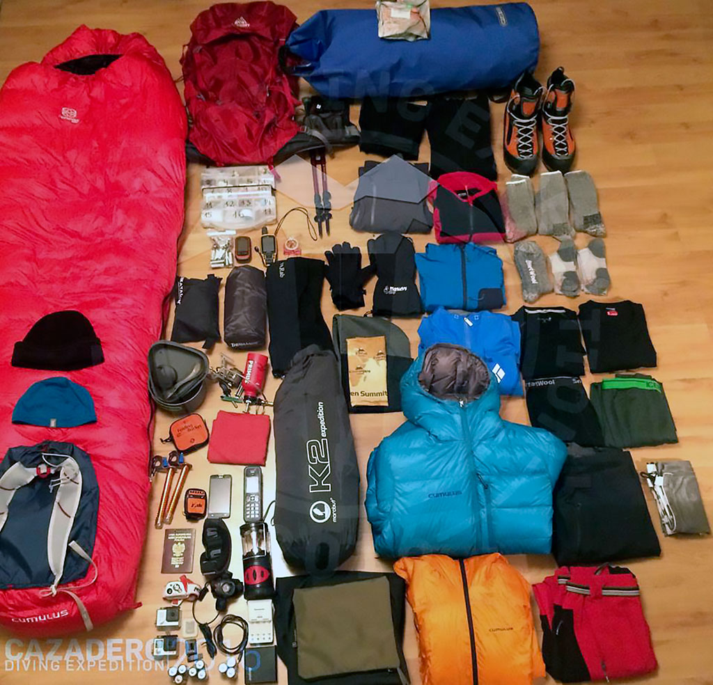 La expedición utilizará estilo liviano (sin porteadores ni armado de campamentos de altura previos) ya que solo somos 4 los integrantes de la misma: Marcel Korkus, Bartek Wnek de Polonia, Herman Binder y yo. Tenemos que llevar a parte del equipo de montaña normal en estas ascensiones todo el equipo de buceo completo, (tubos de oxígeno, reguladores, traje térmico, traje seco, mascara, guantes, botas, aletas y lo más importante, plomo para el lastre de buceo!!!) así que preparando los hombros para los 35 kg de las mochilas.