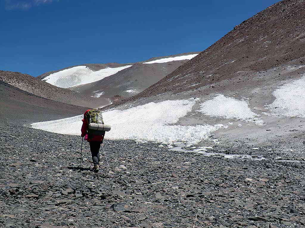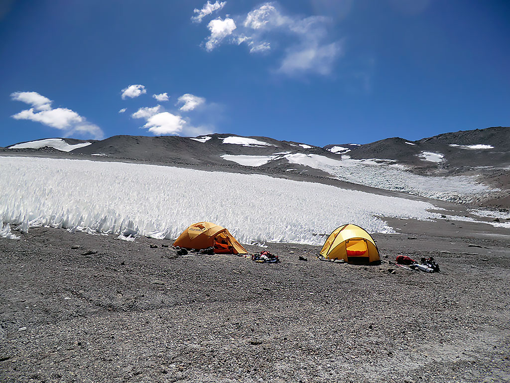 Salimos temprano camino al campamento de altura a casi 5800 mts, luego de recorrer el mismo camino que hicimos hace un par de días llegamos con todo el equipo completo y nos disponemos a armar las carpas y a juntar agua antes que se congele en horas de la tarde, cenamos y nos vamos a descansar.