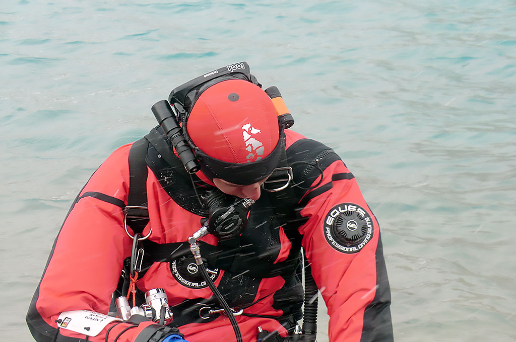 La laguna tiene justo los 5 mts de profundidad, trajimos con nosotros el equipo completo para el buceo, estamos todos listos, Marcel se prepara y ultima uno a uno los detalles de su equipo, el agua está a 3°C y comienza a nevar, hay viento, hace frio, Marcel llega al lugar previsto y se sumerge a los 5 mts durante los 20 minutos que tiene que estar bajo el agua para batir el record, esperamos expectantes a que todo salga bien y no tenga ningún problema derivado de los cambios de presión que supone bucear a casi 6000 mts, un rescate en esta zona es muy difícil ya que estamos en unos de los lugares más inhóspitos de Los Andes.
