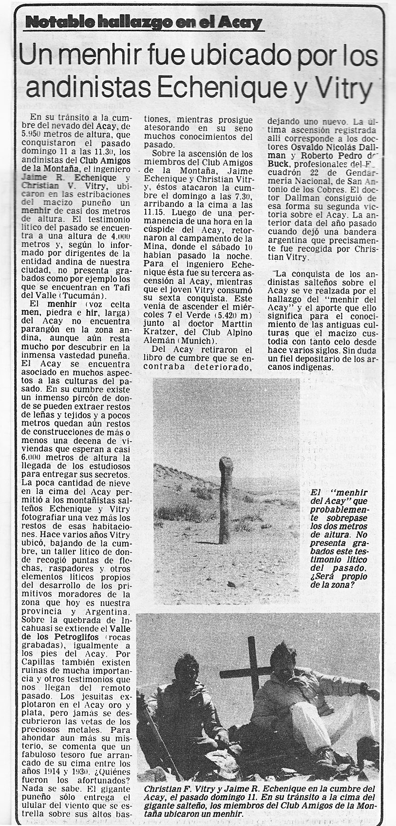 “Unos días más tarde los aventureros de la cumbre del Acay", con evidentes signos de haber cumplido una faena que les demandó muchos esfuerzos. Ello quedaba reflejado en sus semblantes. El viejo Cruz tornó a sus atenciones y nuevamente brindó a los esforzados caminantes lo poco que tenía, pero con el corazón abierto. Gabino Cruz, que por entonces tenía 16 años, dijo al respecto:
