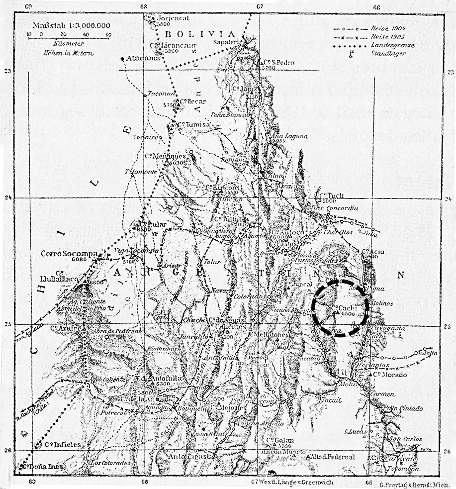 Mapa confeccionado por Reichert, donde muestra los itinerarios seguidos en los años 1904 y 1905, oportunidad en que intenta ascender al nevado de Cachi (señalado con un círculo)