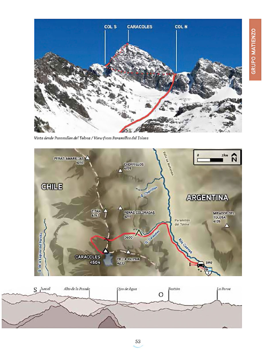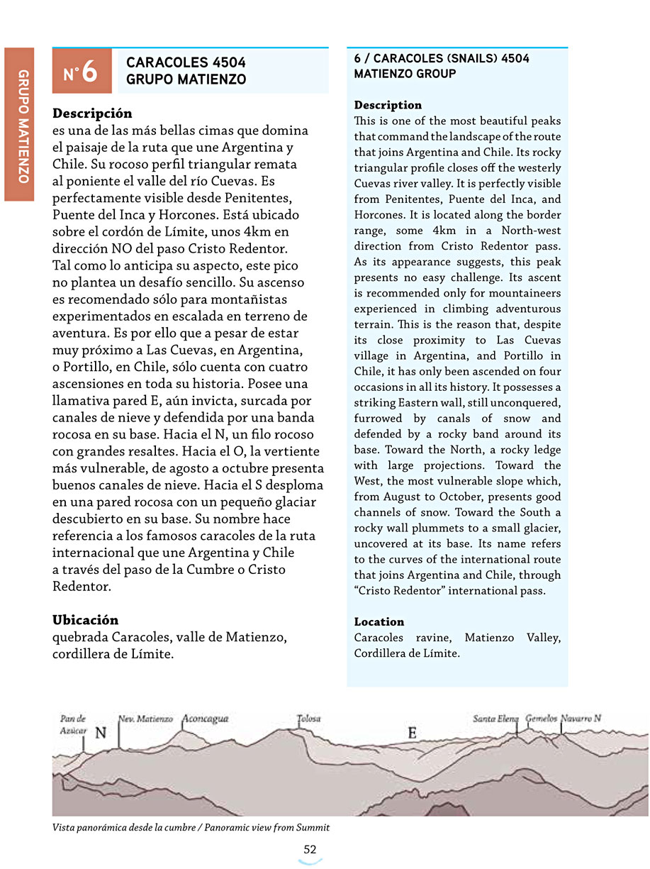 En cada descripción nos ofrece los datos necesarios para intentar su ascenso, toponimia, descripción general, altura, way-points, vía de ascenso, dificultad, tiempo necesario, época adecuada, equipo, recomendaciones y datos de interés. A través de 271 páginas, 64 mapas, 63 fotografías a color con nombres y rutas marcadas, el lector recibe la información necesaria para planear una ascensión y conocer más de los Andes Centrales de Mendoza.