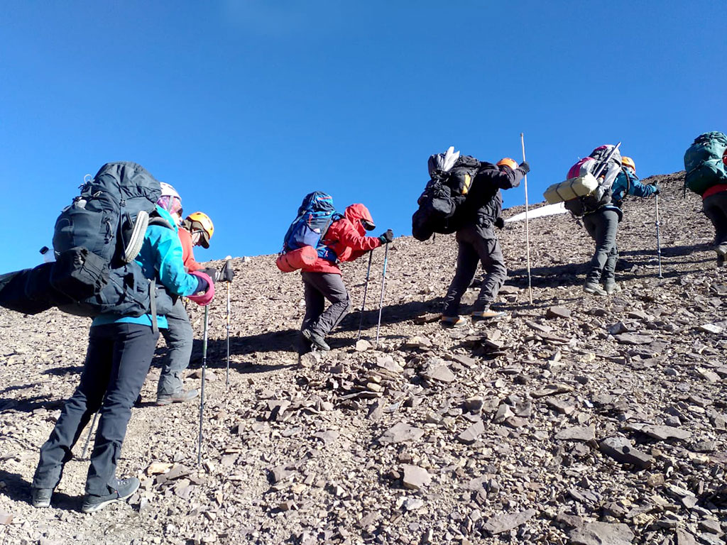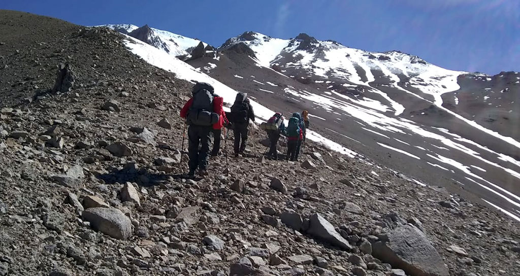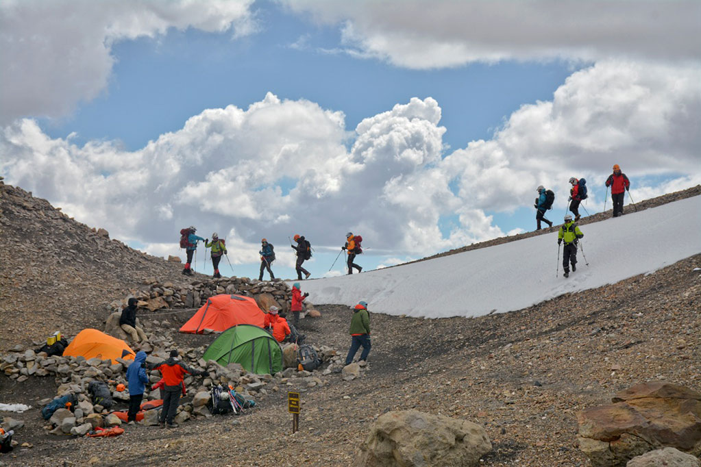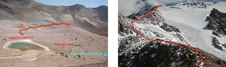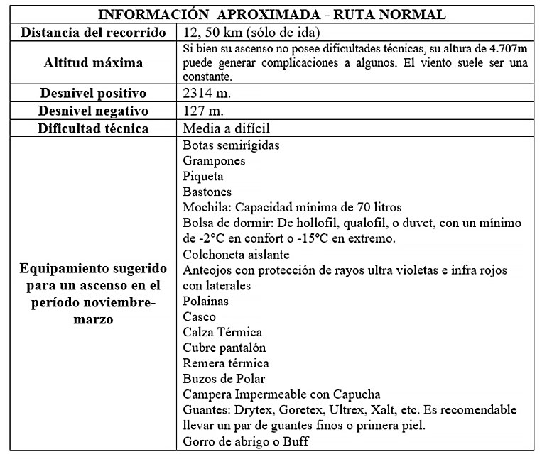 De no estar aclimatado a la altura, es mejor quedarse un día en el campo base (Las Lagunitas, 3000 msnm) y aclimatar en sus alrededores, pudiendo ir ese día a la base del glaciar (a unos 3700 msnm de altura) o al nacimiento del estero Covunco, con abundantes fósiles. A continuación, se puede acampar a los 3.800 (msnm) antes de llegar a la cumbre. Pendientes de 65 grados como la que existe en el sector conocido como ¨La Montura¨ a unos 4.100 (msnm) son parte del camino que deberán transitar los montañistas.
