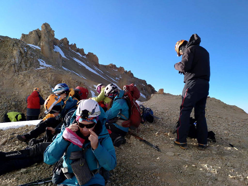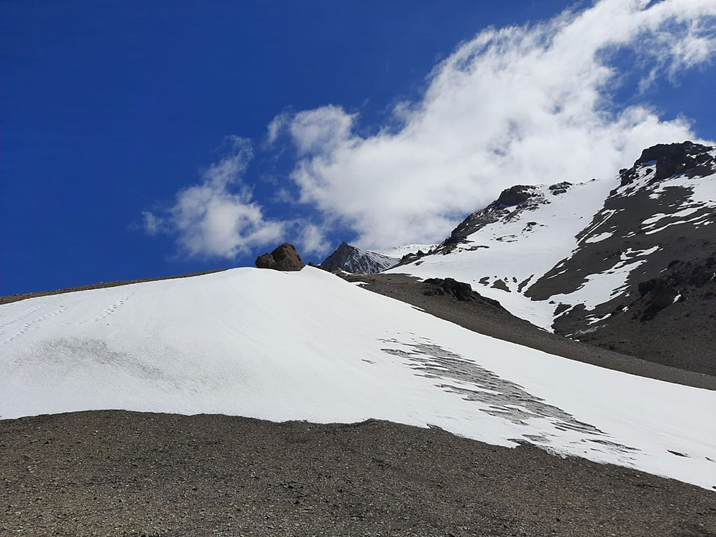 Después de unas dos a cuatro horas de marcha, se llega a un pequeño portezuelo en donde se puede apreciar el glaciar que se desprende al este del Domuyo. Desde acá empieza un trecho de fuerte pendiente por un sector de penitentes –cada vez menos-, por lo que es conveniente calzarse los crampones.