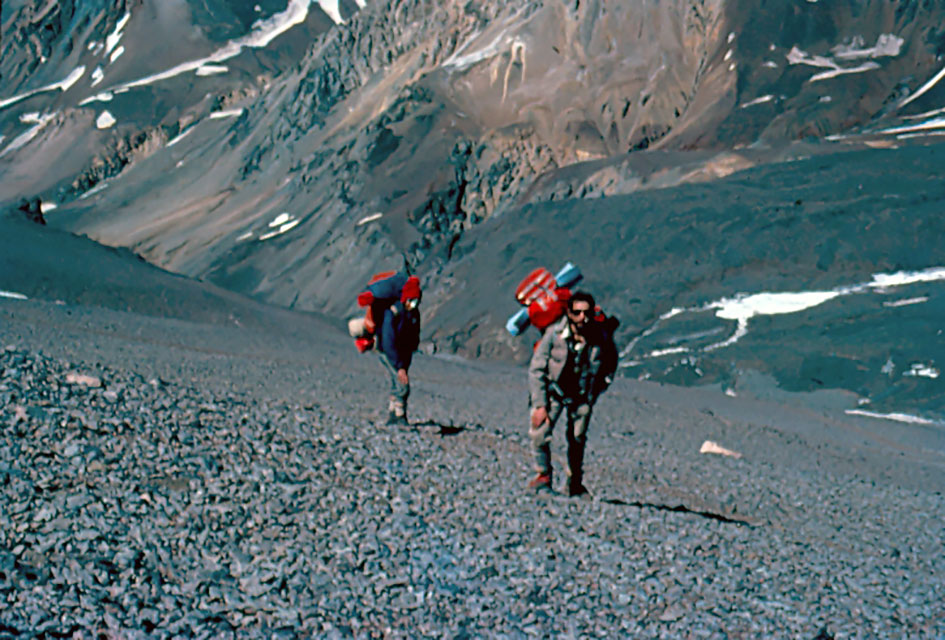 Me alcanzaron Mario y Federico, en el Gran Acarreo seguimos bajando juntos hasta alcanzar a Carlos unos 100 metros antes de alcanzarlo, pensábamos que algo le había pasado, ya que le gritábamos sin respuesta, él no se movía, hasta un rato después se levantaría y daría unos pasos volviendo a sentarse, en ese momento me regresó la tranquilidad, lo alcanzamos y terminamos de bajar hasta el Refugio de Antártida Argentina.