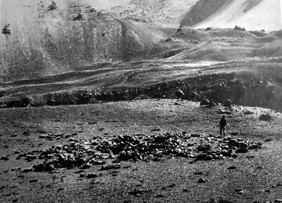Por último, veamos al camélido, prueba aún no declarada fehaciente. Sus restos fueron hallados por Thomas Kopp en el año 1947, cuando conquistó por primera vez la cumbre sur junto a Lhotar Herold. Los dos alemanes, poco antes de la cima, vieron huesos, que al acercarse revelaron ser aparentemente de un guanaco. El animal estaba acurrucado, dobladas sus patas hacia dentro, los huesos en su totalidad de un color muy blanco, salvo el abdomen que aún conservaba algo de cuero. En el libro Jahre Kampf um den Aconcagua (50 años de lucha en el Aconcagua, Thomas Kopp, 1947), Kopp se pregunta textualmente: “¿Un animal a 7000m? ¿Qué hacía esta criatura aquí? ¿Hace cuánto está aquí? ¿Por qué hay sólo huesos cuando los cadáveres de los alpinistas accidentados se conservan por tanto tiempo?”.