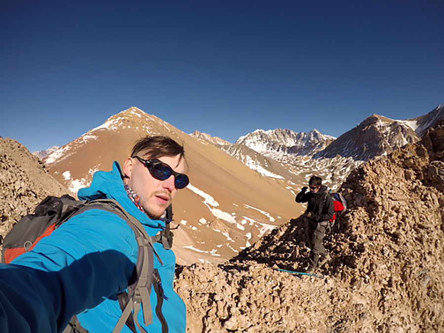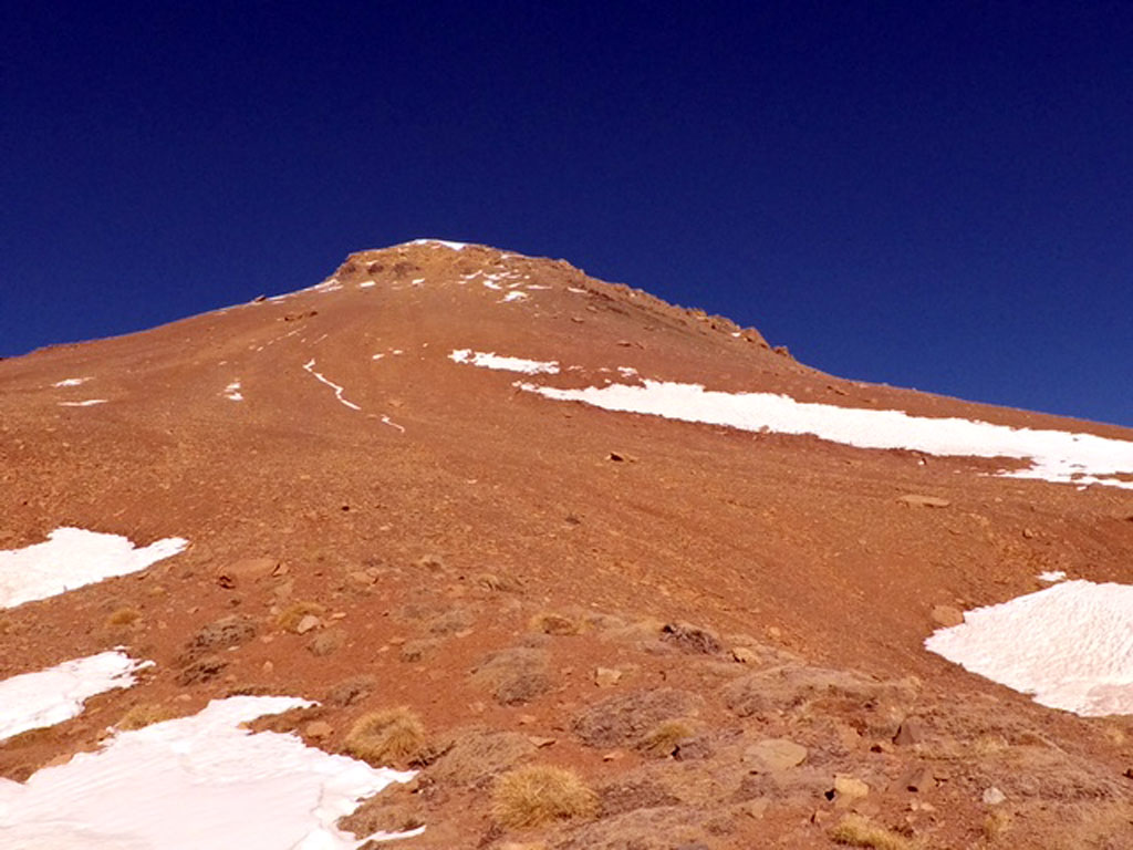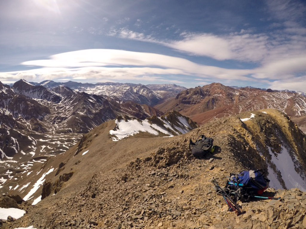 Alcanzando el fin del acarreo, logramos acceder a su cima atravesando algunos manchones de nieve -en los cuales tuvimos que hacer algunos escalones con las botas. De esta manera, pudimos montarnos en el filo final que conduce a la cumbre del Cerro Madre -la separa un desnivel aproximado de 80 m y 200 m de distancia- desde el cual puede divisarse el pircado cumbrero. Finalmente, llegados a la cumbre, alcanzamos una vista panorámica de estética amplitud.