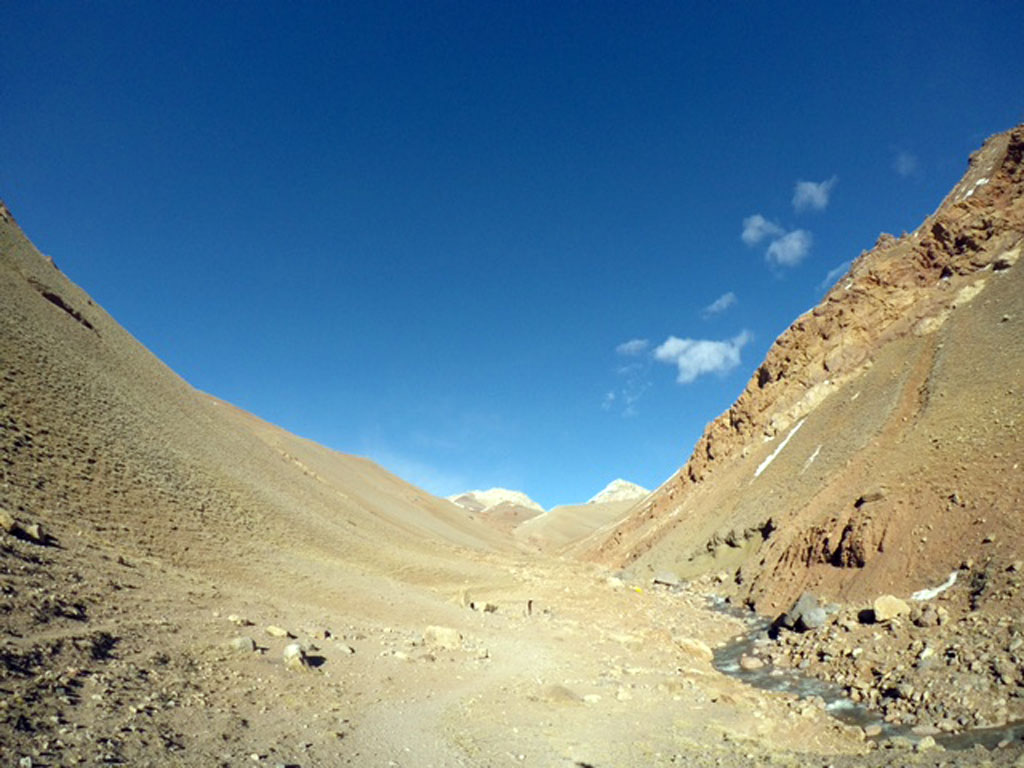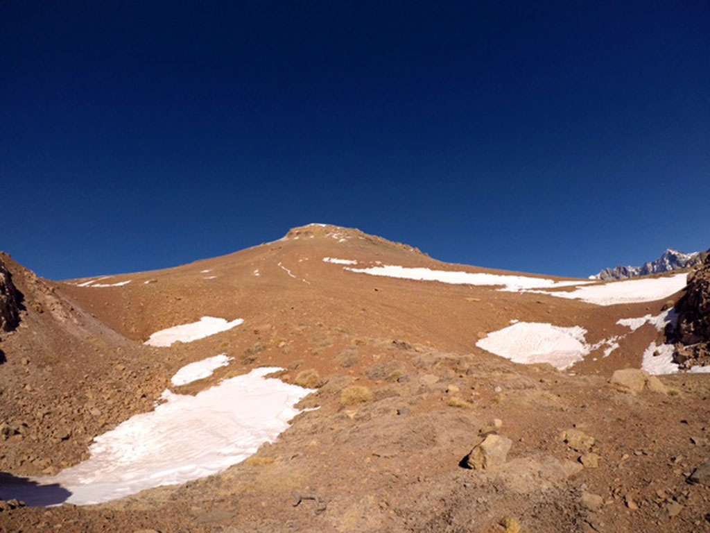 Por lo tanto, considerando múltiples variantes, confirmamos nuestra propuesta de trazar una singladura directa y continuar por la Montaña de Yeso: de terreno removido, inestable, inconsistente y agrietado. De esta manera, fuimos ganando metros hasta tener que descender hacia el col que permite el tránsito entre el Valle de Yeso y la Quebrada de Laguna Seca (aproximadamente en la altura hacia la entrada al Valle de Punta Salada Noreste). Siguiendo esta ruta directa, hay que enfrentar un considerable acarreo de piedra suelta y sostenida inclinación. Allí, para el ojo atento, se puede reconocer algunos restos de amonites. Esta ruta directa (NNE), se distingue de otras rutas de ascenso a este cerro: como la que se realiza normalmente desde el col del Serrata (NE - vía normal), y de la que se realiza desde la Quebrada de Laguna Seca (NNO) -ruta que tomamos para el descenso.