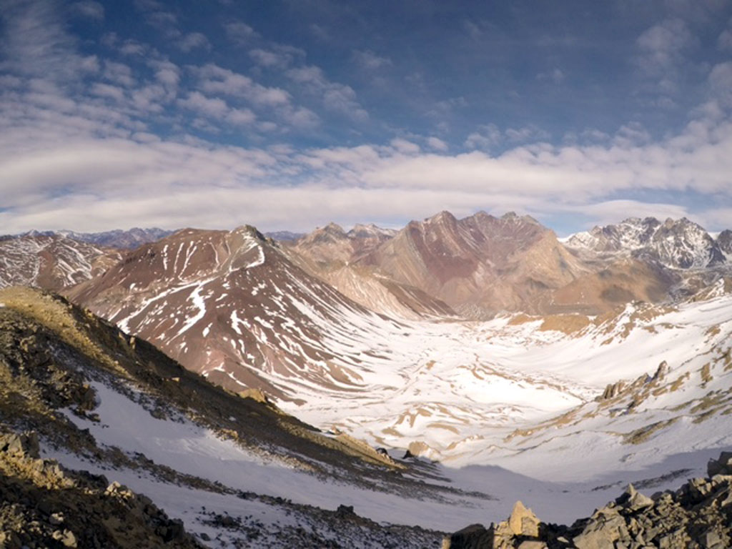 Por momentos, azotaba un viento blanco con temperaturas que llegaron a oscilar entre los -25° y -22°. Asimismo, en otra jornada, abordamos el área del Co. Amarillo y Co. Quebrada Blanca a partir del tránsito por corredores de hielo y nieve desde una ruta no normal. El uso de grampones y piquetas nos permitió una buena tracción por ellos, alcanzando la subida de una pala de hielo y nieve que nos montó en un col a 4100m: el cual nos conducía hacia el corredor que se dirige directo al Embudo pre-cumbrero.