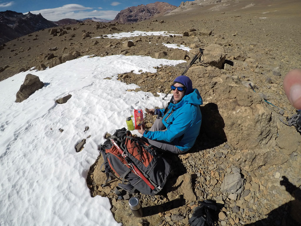 Sin embargo, el espacio de cumbre no nos permitió estar más de 30 minutos, debido a las bajas temperaturas que comenzaban a sentirse producto de un aumento de viento. Por lo tanto, comenzamos el descenso alrededor de las 14hs, sabiendo que en el Refugio Grajales el sol se ocultaba a las 16:45hs, y que a las 19hs ya oscurecía. De esta manera, decidimos reponer algo de energía, 80 m más abajo, con un pequeño almuerzo luego de descender el acarreo hacia la Quebrada de Laguna Seca, antes de finalizar nuestra actividad una hora y media después alcanzando finalmente, a las 17hs aproximadamente, al Refugio Grajales.