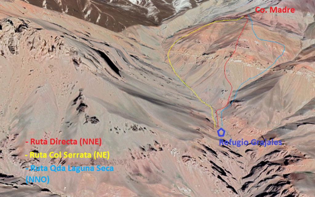 Saliendo del Refugio Grajales a las 8.30hs, logramos llegar inmediatamente a la zona de la Confluencia -la cual permite adentrarse en la Quebrada de Laguna Seca- para ascender hasta el Punto Panorámico (3400m), permitiéndonos una visión magnífica en esta altura. La vista desde el Punto Panorámico hacia el Cerro Madre permite distinguir una elevación rocosa que se le antepone: la denominada Montaña de Yeso. Esta elevación permite alcanzar un desnivel positivo mayor a los 3400 m del Punto Panorámico: precisamente llega a alcanzar los 3790 m, aproximadamente. Luego, para continuar rumbo al Cerro Madre, se debe descender de altura a un collado que permitiría el paso entre el Valle de Yeso -en los alrededores del Portezuelo Serrata- con la Quebrada de Laguna Seca.