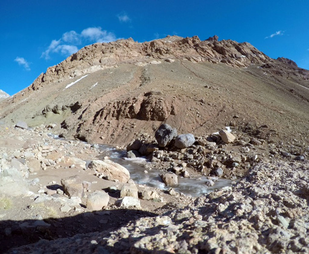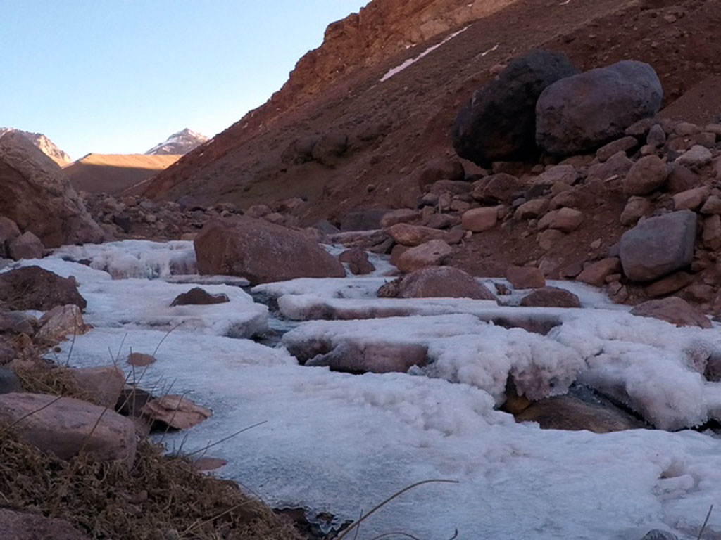 Volver a ingresar en la Quebrada de Vargas nos remontó a actividades pasadas desde recuerdos muy agradables: desde la circunvalación al Penitentes, hasta distintas actividades cuatromilistas realizadas hace algunos años (entre el Co. Penitentes y distintos morros en dirección al Co. Visera, y entre el Co. La Embarcada, el Co. Serrata, el Co. Pírámide Negra y el Co. Guimón). A medida que comenzábamos a transitar la quebrada, el arroyo de Vargas se dejaba avistar, tímidamente, entre la nieve y el hielo que cubría la mayor parte de sus márgenes. El sonido de su caudal nos permitía asentir sobre su presencia. Asimismo, tuvimos que vadear en varias ocasiones sobre hielo y nieve.