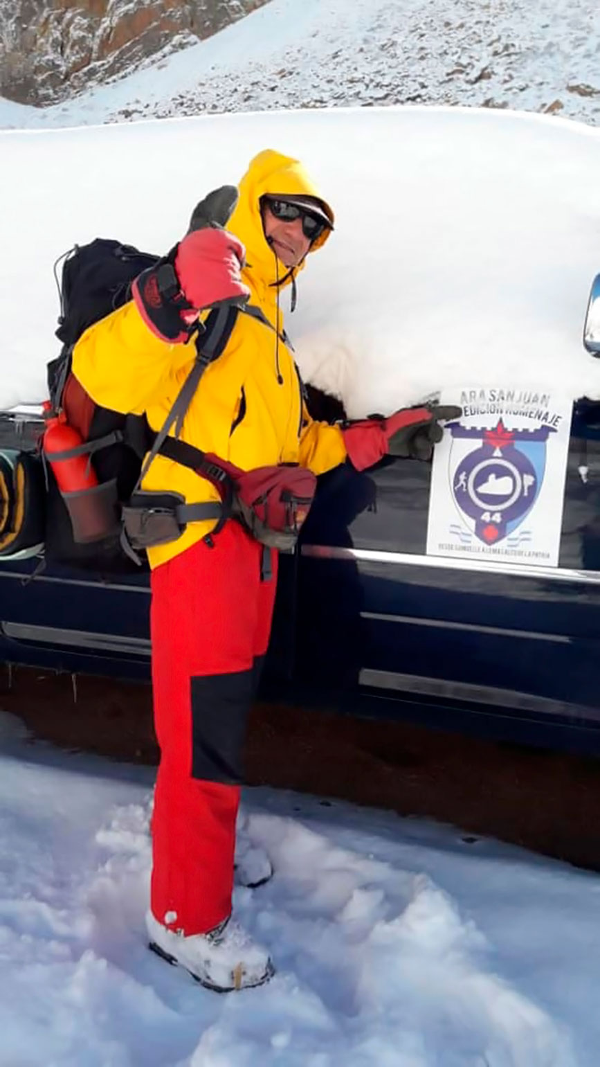 Coraje, esfuerzo físico, voluntad y una motivación muy profunda lo acompañaron en todo el recorrido, y en el ascenso al Aconcagua conto con la compañía de dos expertos amigos: el guía Gabriel Cabrera, (quien concretó en esta oportunidad su cumbre 49 del Aconcagua ), y el marplatense Alejandro Cruces y por supuesto fue invalorable la cercanía con la bandera argentina con los nombres de los 44 submarinistas que llevara junto a él todo el tiempo.