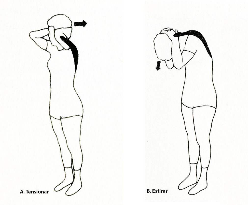 Junte las manos detrás de la nuca y presione la cabeza contra la resistencia ofrecida por estas, fuertemente hacia atrás durante unos 20 segundos.
