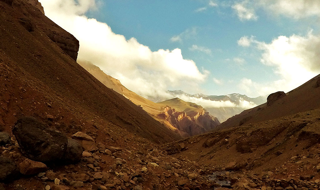 Cuando íbamos adentrándonos en la Quebrada de Vargas ya comenzamos a agudizar los sentidos. Intentábamos reconocer aspectos que nos pudieran brindar un trato más familiar para cuando nos volviéramos a encontrar nuevamente en ese valle colgado cuatro días después, luego de finalizar una circunvalación al macizo de Penitentes que nos llevaría, justamente desde Penitentes, hasta Punta de Vacas, pasando por la Quebrada del Río Blanco y la Quebrada del Río Tupungato.