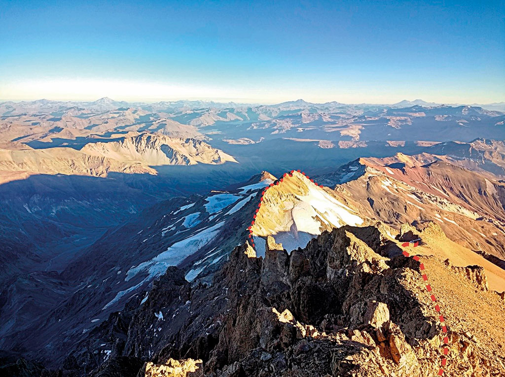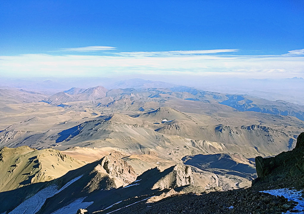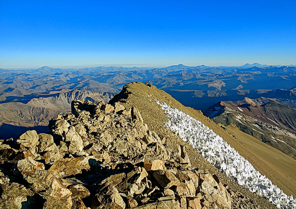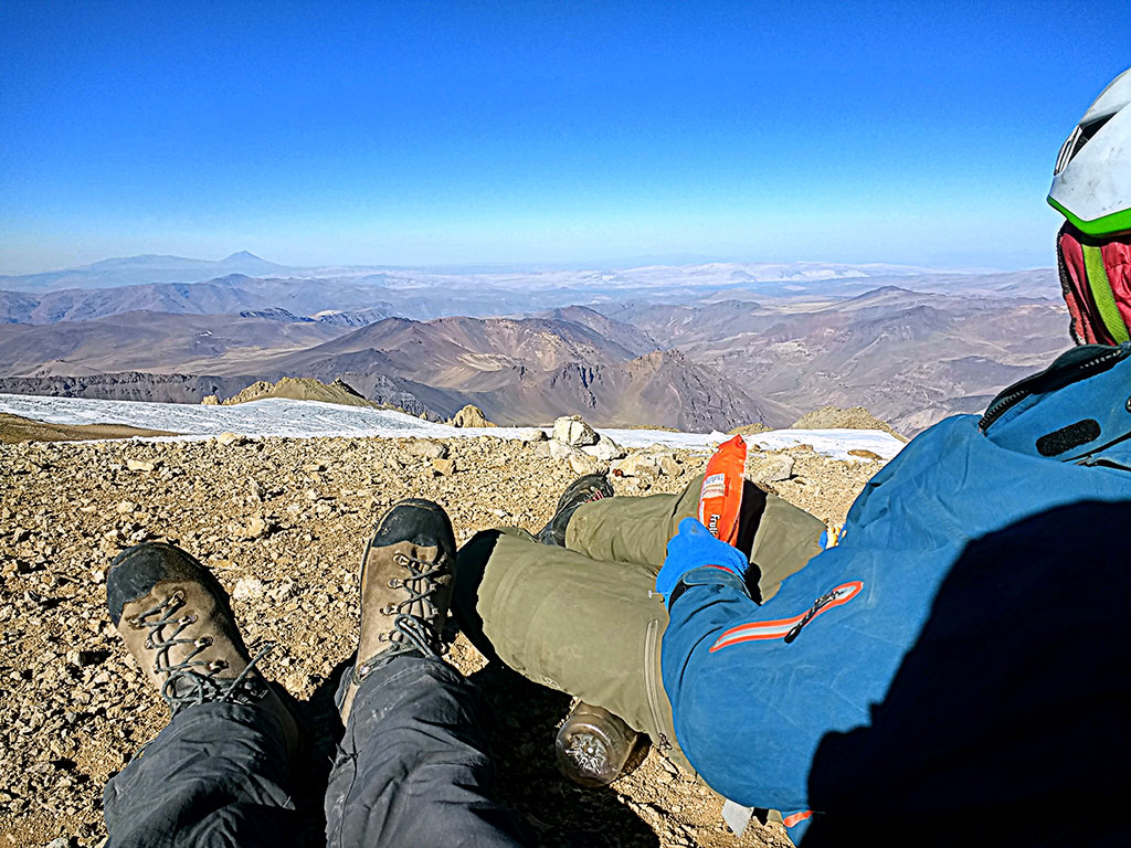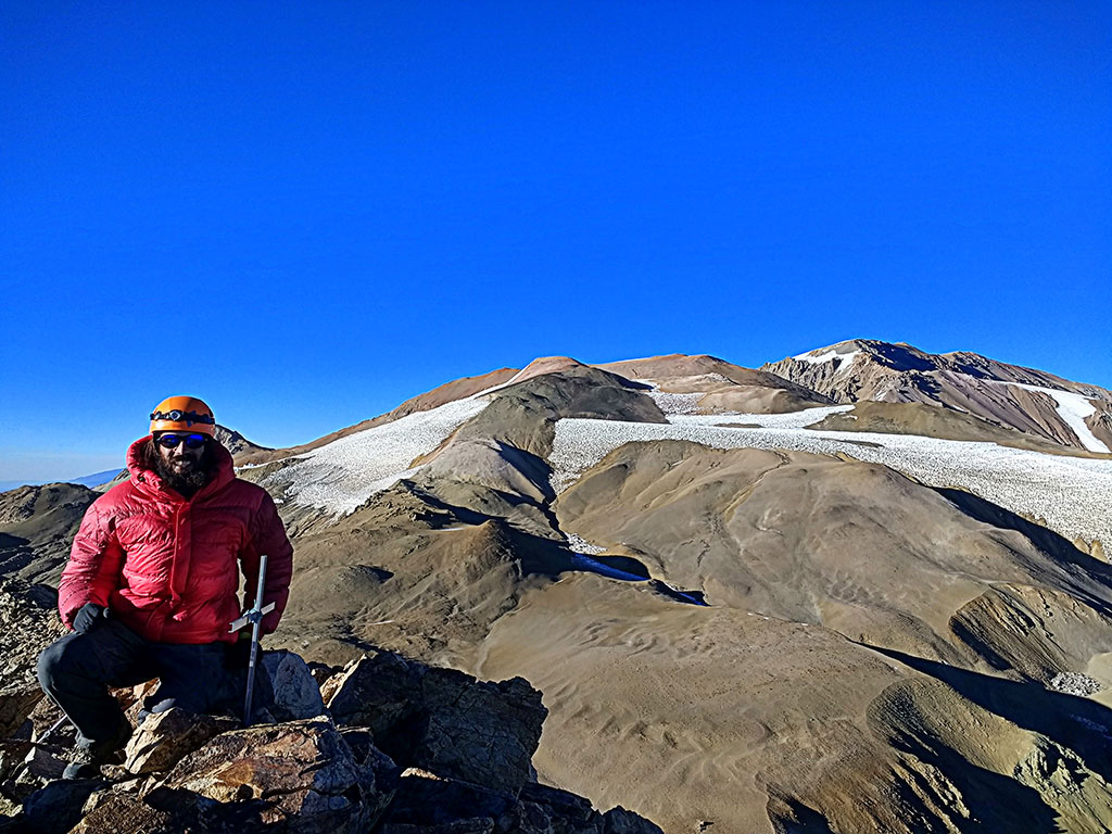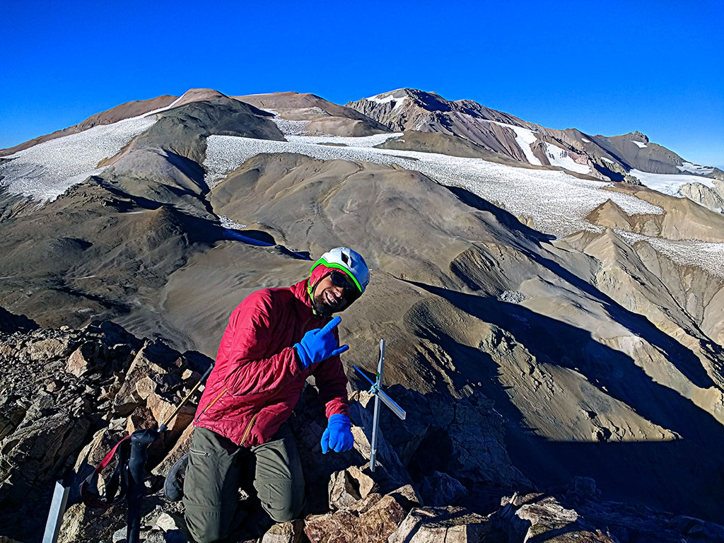 Ingresamos al tramo final hacia la cumbre del volcán Domuyo, en pleno ascenso un cóndor juvenil nos sobrevolaba, lo cual es una pintura típica del cielo patagónico. Se podían ver señales que indicaban nuestro destino, comenzamos a mermar nuestra marcha tocando el techo de la Patagonia a 4709msnm a las 17:00 horas, lo habíamos logrado, luego de una planificación precisa durante dos años; un abrazo fue la rúbrica para tamaña proeza, sólo restaba contemplar el lugar, tomar algunas fotografías para testificar lo realizado.