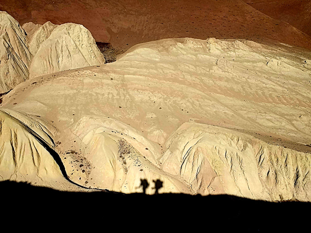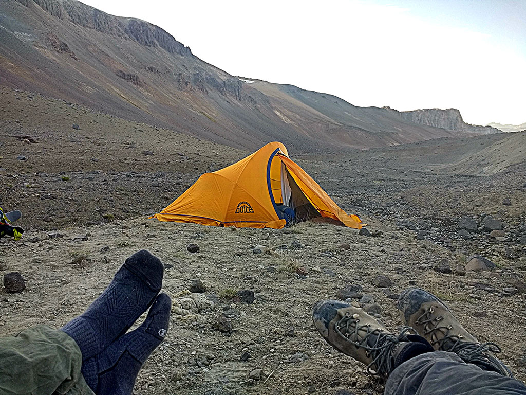 Desde ahora se iniciaba el descenso a los 3800 msnm; las condiciones de vientos fuertes complicaban aún más esta parte del recorrido. Cuando el reloj señaló las 20 horas arribamos al campamento, estábamos exhaustos, fue el día más largo de todo el recorrido. Las condiciones meteorológicas no mermaron durante toda la noche, pero no fueron razón para no poder conciliar el sueño reparador.