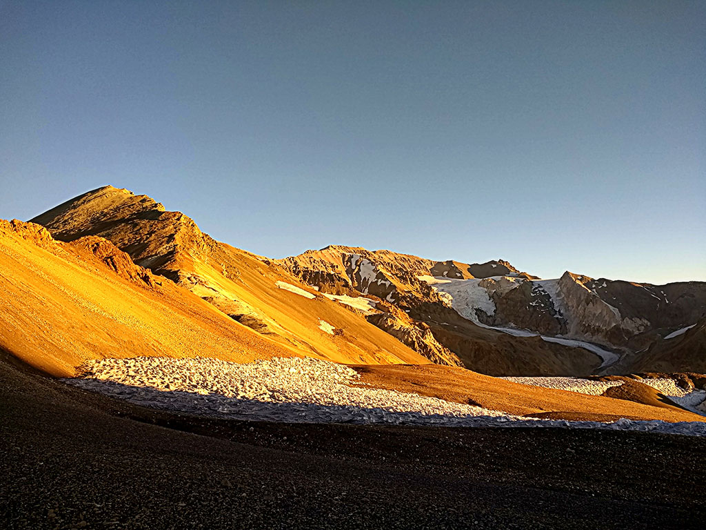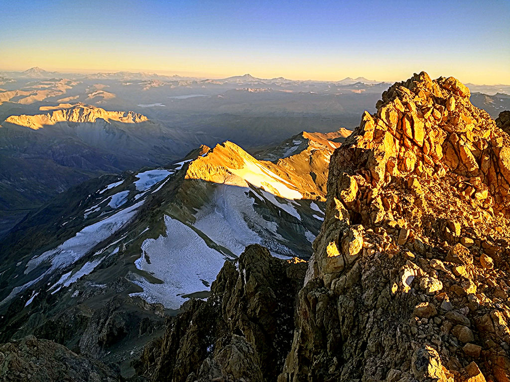 En este punto comenzamos el descenso por un terreno de penitentes, hasta el abra y comenzamos el ascenso por el glaciar de la cara Este, donde el cordón se hace más ancho, seguimos con dirección SSO, hasta la tercer cumbre que bautizamos con el nombre de “Tronco de Oro” (4423msnm), desde este punto no hay calificativos para poder describir la inmensidad y variedad del paisaje compuesto de cavernas glaciares, grietas, etc. Sin embargo, el último reporte meteorológico indicaba mucho viento para las próximas horas, entonces debíamos apurar la marcha hasta la cuarta cumbre que bautizamos como “Peine de Oro” (4465msnm), a la cual llegamos 14 horas después de haber iniciado la jornada.