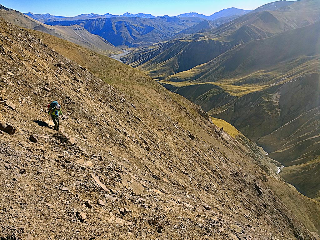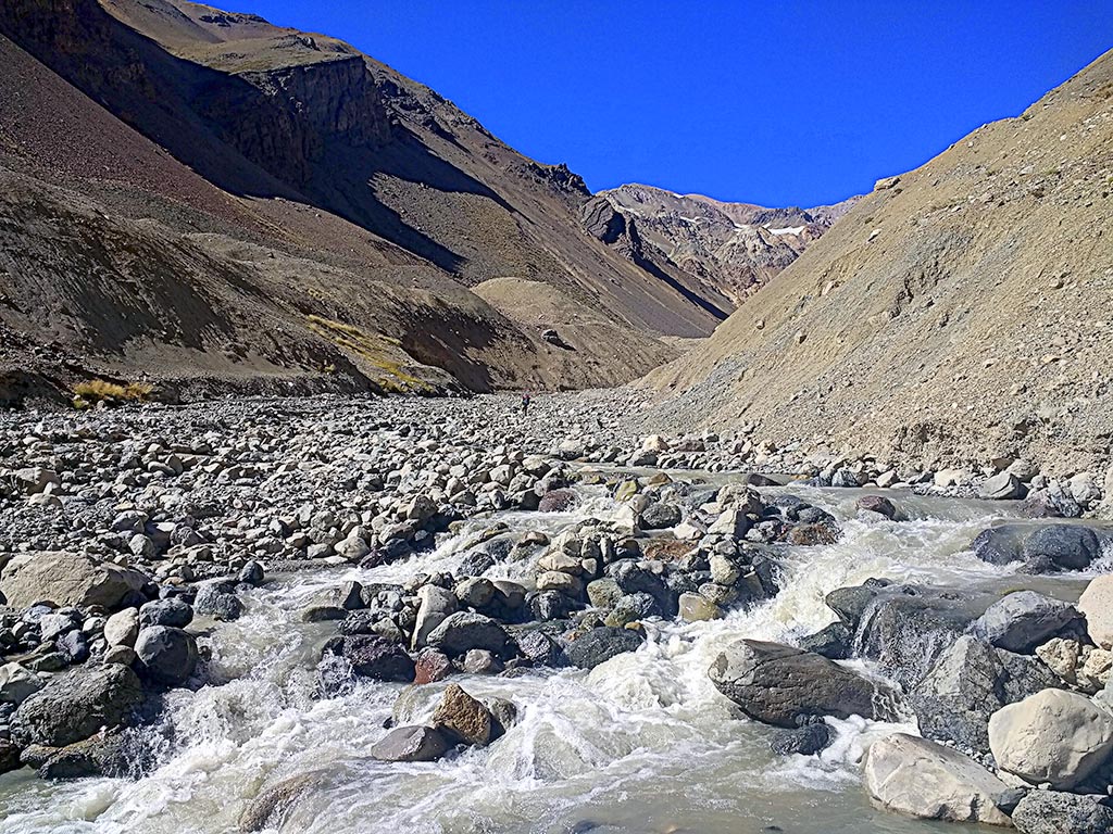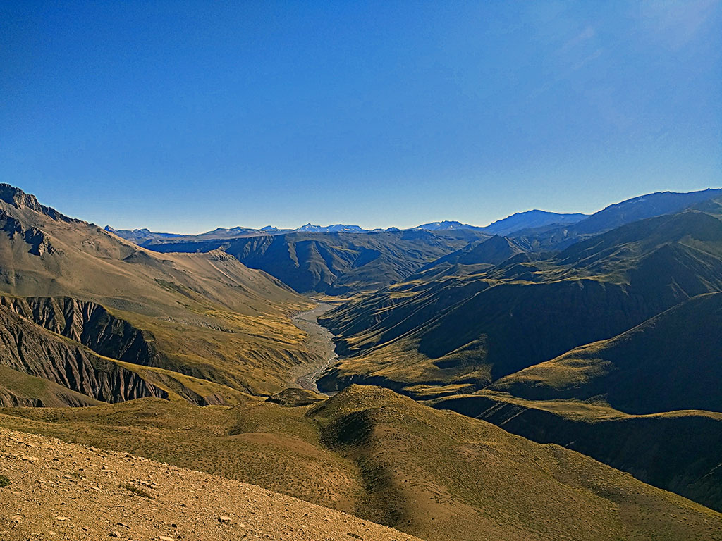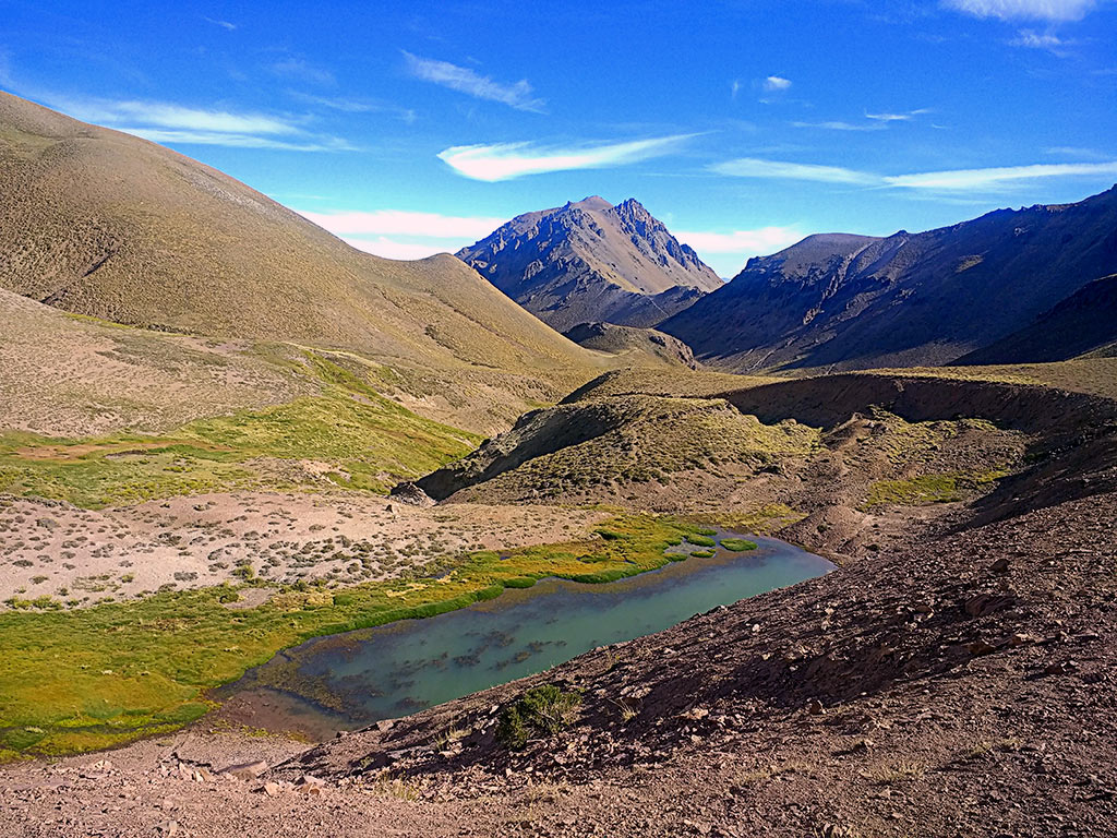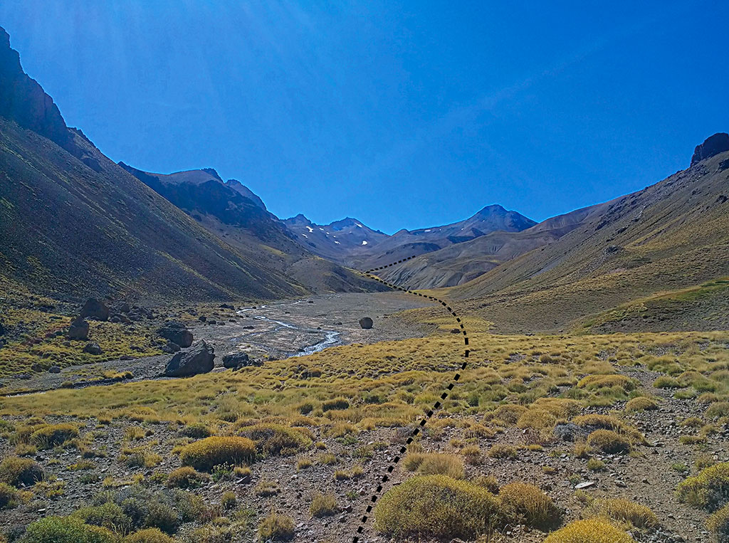La segunda etapa sec inició a las 9 de la mañana, con una caminata de un kilómetro y medio en dirección NNE hasta la división del arroyo, desde este punto continuamos por el faldeo del margen derecho hasta salir a un increíble mirador donde se puede vislumbrar el valle del arroyo Turbio, en dirección Este el cordón por el cual subiríamos y hacia el Sur el volcán Domuyo.