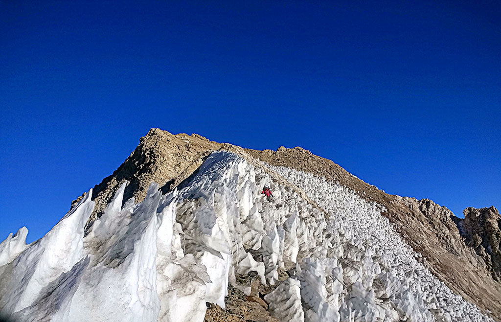 Finalmente, a las 3:30 de la madrugada llegamos a la primera cumbre, tomamos una estaca de aluminio y la bautizamos con el nombre “Toro Colorado” (3905 metros sobre el nivel del mar), pero este no era nuestro destino final; nos desmontamos de la cumbre hasta el abra, lo que no fue nada fácil ya que no teníamos buena visibilidad y el tramo más fino de la arista se encuentra de bajada. Iniciamos el descenso al abra y luego el ascenso hacia la segunda cumbre, los rayos del sol comenzaban a marcar nuestro destino, alcanzamos la cima a las 8:30, el nombre escogido fue “Caballo negro” (4251msnm). Tuvimos que hacer un alto para derretir nieve y poder tener una buena provisión de agua, para una etapa extensa y agotadora.