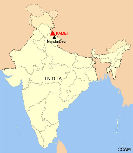 El monte Kamet de 7756 msnm es la tercera montaña más alta de la India. Se encuentra ubicada en el Himalaya del Garhwal, en las coordenadas 30º 55´12´´ N 79º 35´36´´E.