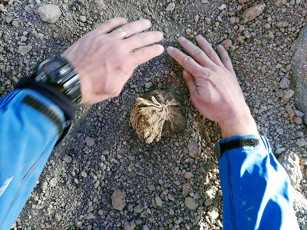 Por ello, con su GPS, tomó nota de la posición en que se encontraban, también varias fotografías y volvió a dejar la ofrenda en su lugar.