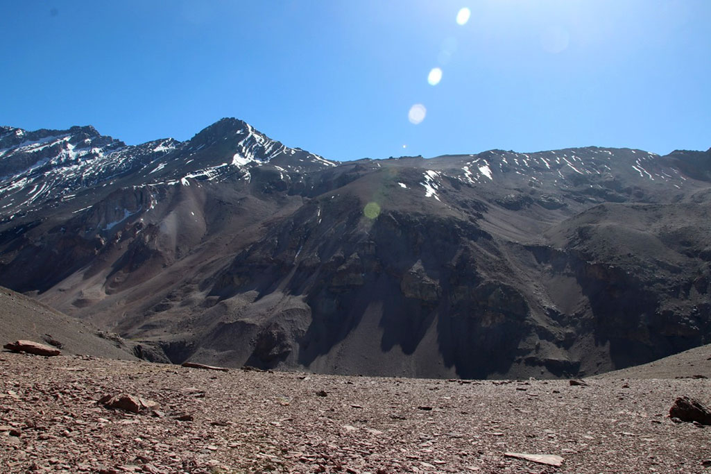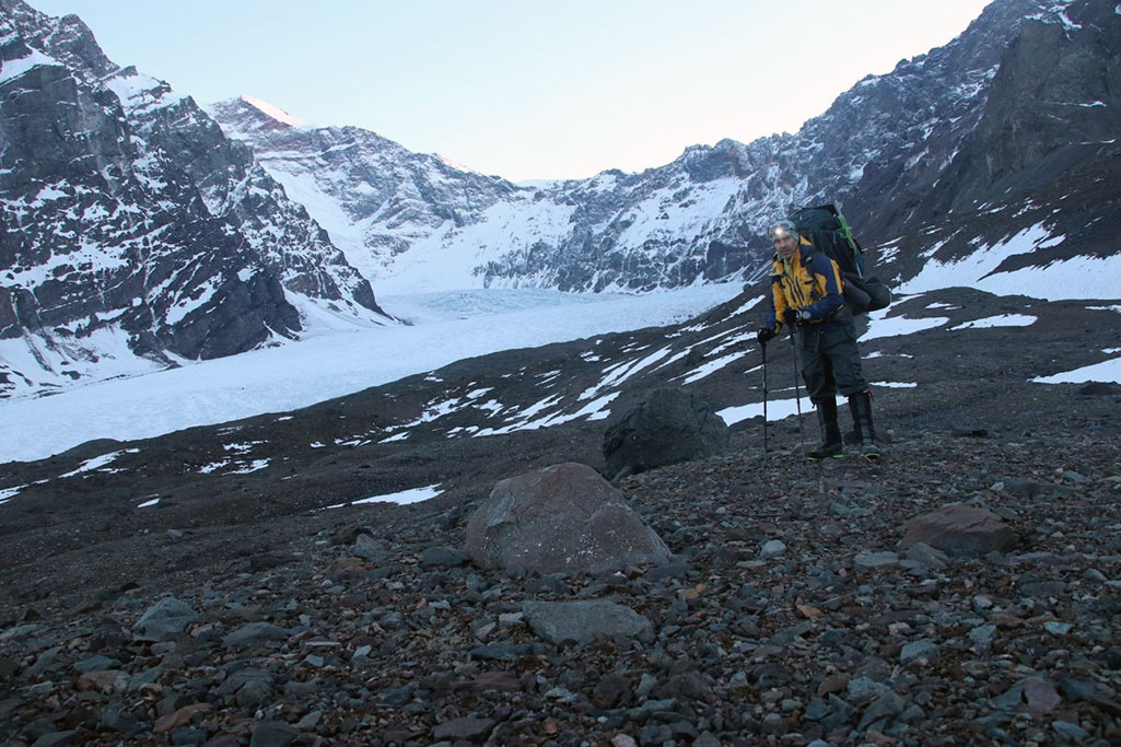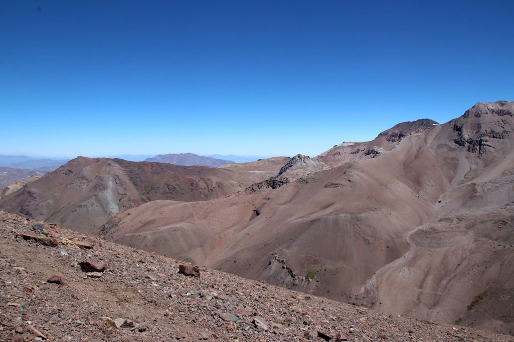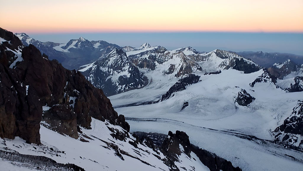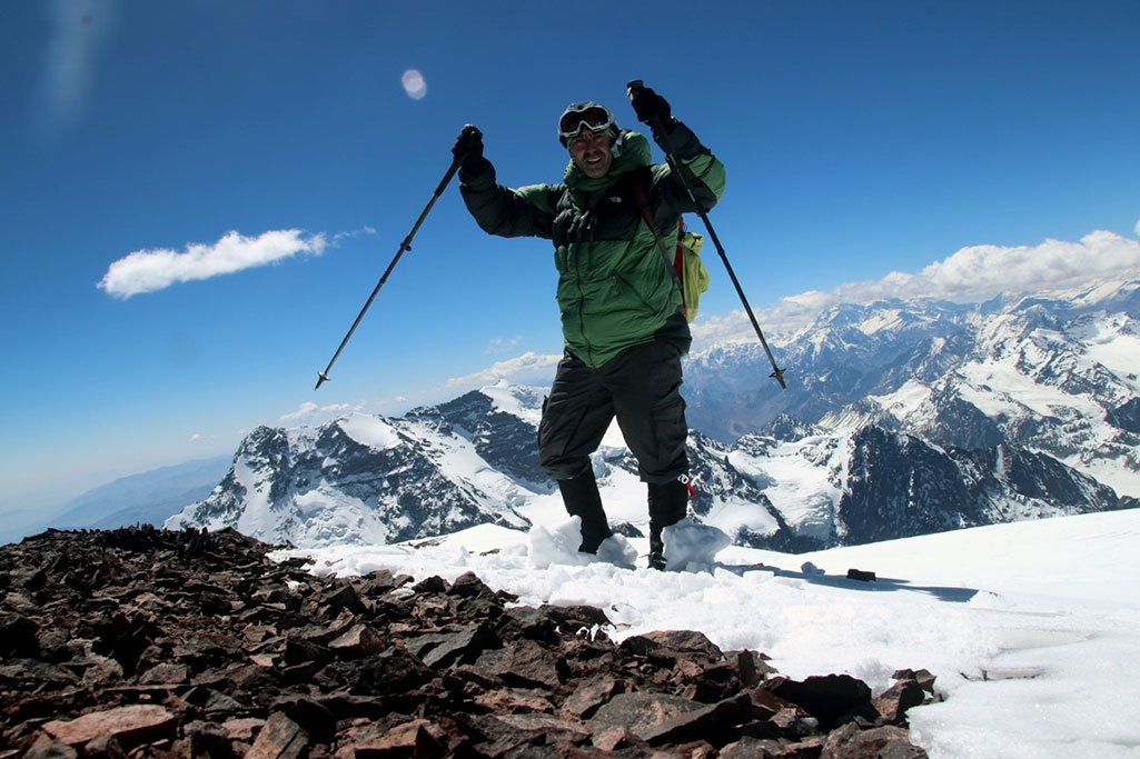 No sabía que después de haber cruzado los farellones aun me quedarían unas 4 hs., las que a cada paso exigían más esfuerzo. Finalmente, luego de haber cruzado una falsa cumbre, logré divisar la principal, la que se había mantenido esquiva todo el camino. Ya habiendo remontado el filo cumbrero, pude alcanzar la altitud máxima de 6070 msnm. Así comencé a disfrutar de la vista y sacar más fotos que “chino en vacaciones”, ya que la vista que se tiene es maravillosa. Pude ver con claridad el Tupungato, el Marmolejo, el Nevado Piuquenes, el Cerro Alto o Nevado San Juan y la imponente pared sur del Aconcagua, también la magnífica pared sur del Nevado Juncal y la inmensidad de los glaciares que circundan esta montaña.