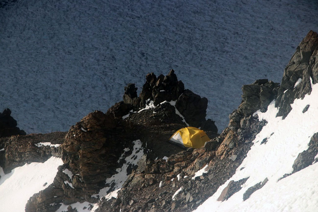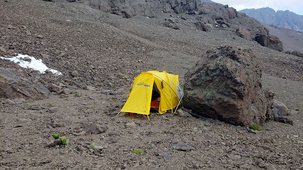Mi quinto día, debido a que estaba a 3 km. de donde debería haber instalado mi campamento el día anterior, me significó salir unas 3 h. antes. Lo hice a las 4 am, rumbo al campamento alto ubicado a 5200 msnm. Hacer este trayecto desde el refugio al campo alto, me tomo 13 h., debido a lo desmembrado de la ruta y al desnivel de unos 1200 m.