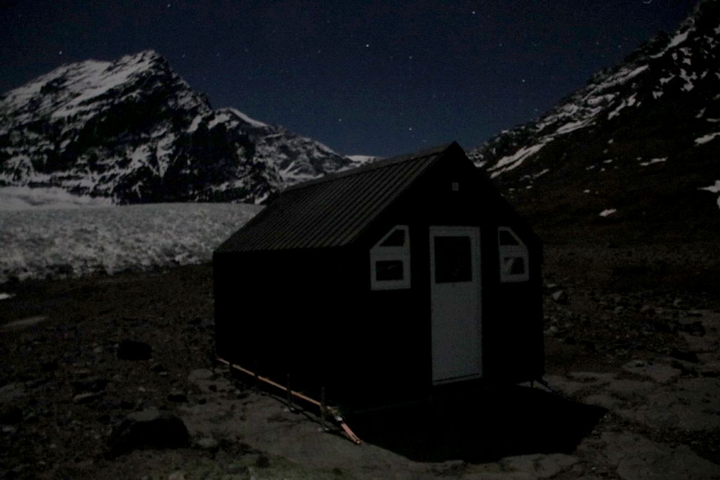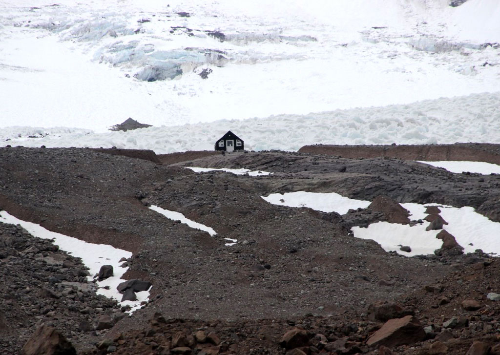 Con menos peso, comencé mi cuarto día con bastante buen tiempo. Era un camino sin huella y bastante solitario. Tras unos 7 km. de marcha, comenzó a bajar rápidamente la temperatura y se comenzó a cerrar la montaña. Estaba a poco más de 4 km. de donde supuestamente instalaría mi cuarto campamento. Con bastante frío y un poco de nieve, trataba de seguir caminando cuando divisé a lo lejos una especie de refugio, por lo que tome mi cámara fotográfica y acerqué el foco lo más que pude. Para mi sorpresa, se veía un refugio de construcción bastante nueva, por lo que decidí acercarme y ver si podía quedarme ahí. Tras una media hora, alcancé el refugio. Estaba abierto con bastantes comodidades en su interior. Dado el mal tiempo, resolví quedarme ese día ahí y recuperar energías.