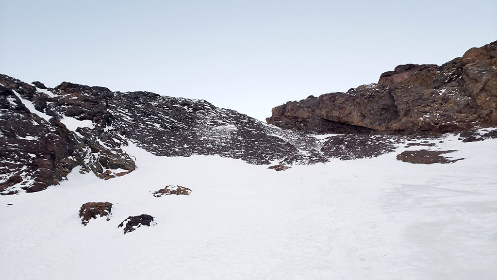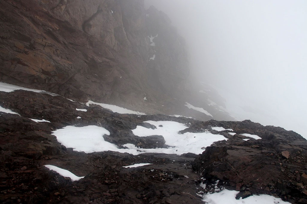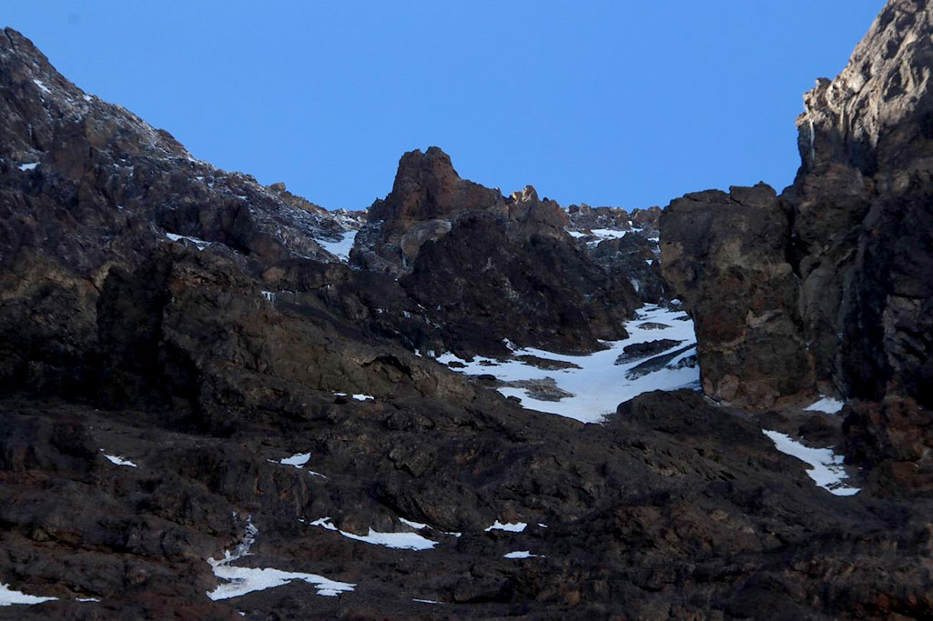 Ya en los farellones donde supuestamente habría un paso entre ellos, no lo pude encontrar. Por ello, decidí cortar a lo derecho y luego trepar en una roca de muy mala calidad por la cantidad de nieve polvo que tenía. Eso hacía más difícil el ascenso. Tras haber sorteado este obstáculo, luego de dos agotadoras horas, el camino se hacía poco más llevadero, no digo fácil, ya que a estas alturas y en las condiciones en que se encontraba la montaña, todo es más difícil.