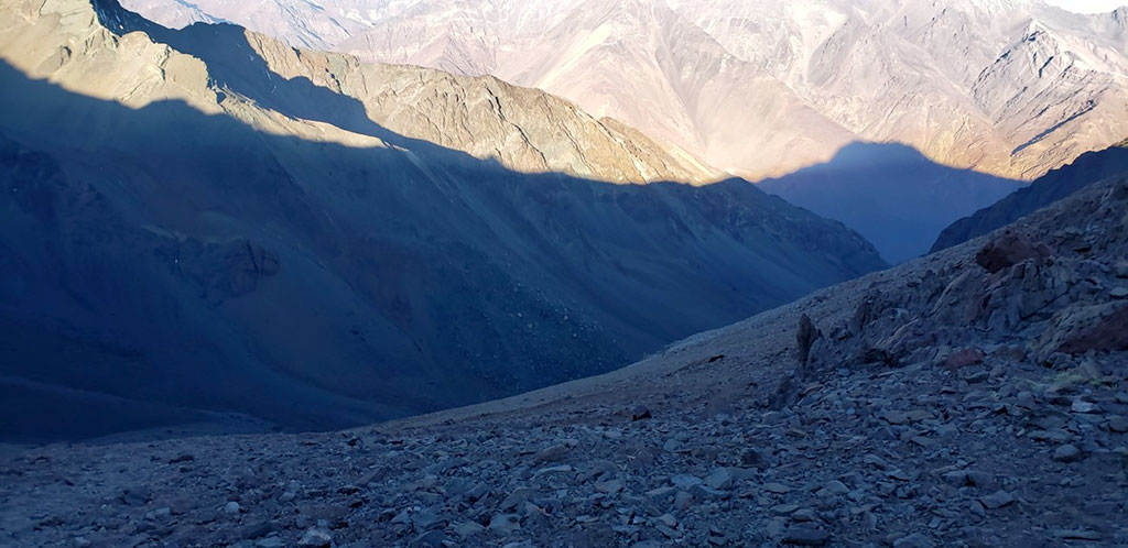 La alarma del reloj sonó a las 3 am. Comencé a vestirme mientras se calentaba el agua, luego de un desayuno de campeones (pampita con salame y té), salí de la carpa para hacer un par de fotos nocturnas hacia la Cara Sur del Nevado Juncal. Luego, comencé a subir realizando unos zigzag en dirección hacia unos farellones que cortaban el camino.
