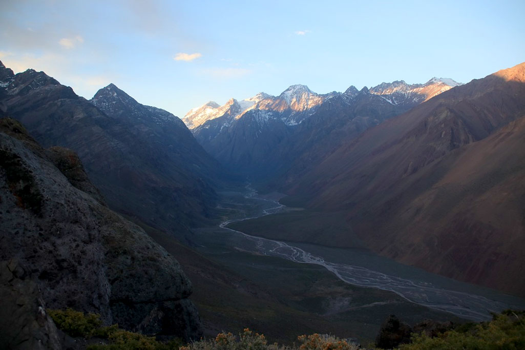 Habiéndome alimentado bastante y habiendo recuperado energías, me acosté muy temprano para poder levantarme a las 3 am para salir una hora más tarde rumbo a Los Españoles. Allí logré llegar a las 08:20 h. Recogí mi equipo de trekking, me cambié y comencé el descenso hasta la base de Loma Rabona, lugar donde había instalado mi segundo campamento. Considerando que había llegado cerca de las 13:00 h., decidí avanzar todo lo que pudiera, con la intención de cruzar el río en el sector de las pircas para llegar a Vega Amarilla. Debía estar en Santiago el día domingo dado que mi hija tenía su primer día de clases el lunes. No le podía fallar. Logré llegar a las pircas a las 17:50 h. Como me quedaba tan poco para llegar a la vega, intenté cruzar el río Olivares, se notaba bastante más crecido que el día que lo crucé de ida. Por ambicioso o por ese sentimiento de triunfo por haber llegado a la cumbre, me tiré a cruzarlo y cuando estaba a punto de traspasar el último ramal, me tumbó la corriente con mochila, cámara y todo lo que llevaba. Afortunadamente la misma corriente me tiró a la orilla, pero a la misma de donde venía. Completamente mojado y con la mochila pesada como si llevara piedras, traté de cruzar por otros brazos pero fue infructuoso. Ya con frío y con el atardecer acercándose, decidí armar mi campamento en las pircas y aprovechar para que se secaran un poco las cosas. La idea era tratar de cruzar al día siguiente durante la mañana, lo más temprano posible.