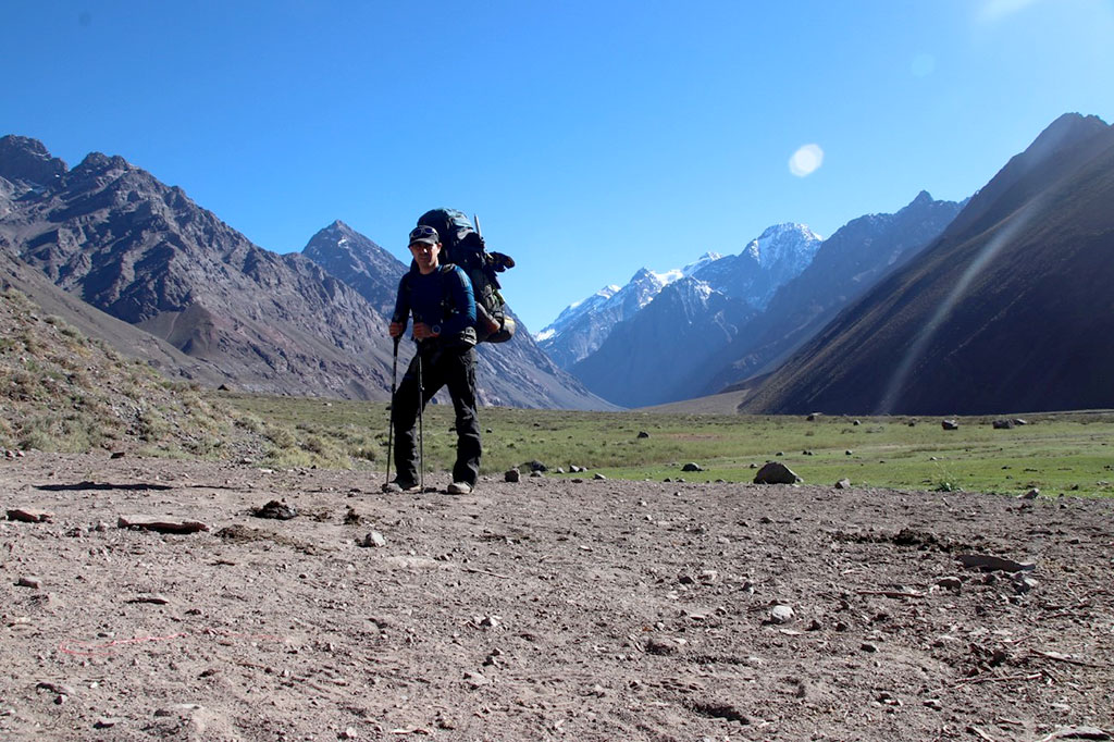 Una vez al otro lado del río Olivares, mi tarea era llegar lo más rápido a Vega Amarilla a 2.300 msnm y comenzar a subir hacia el paso del Cepo, ubicado a 4.100 msnm. A paso rápido, me tomó cerca de 2 h. llegar a la vega, donde aproveché para hidratarme y llenar las botellas con agua. Una vez repuesto y con los niveles llenos, comencé la ardua tarea de subir. Tras varias horas y tras un descanso al borde de un salto de agua, logré llegar a la cima del paso del Cepo, exactamente a las 19:15 h. Allí, aproveché para llamar a mi esposa Karina puesto que por la altura el celular algo agarraba de señal.