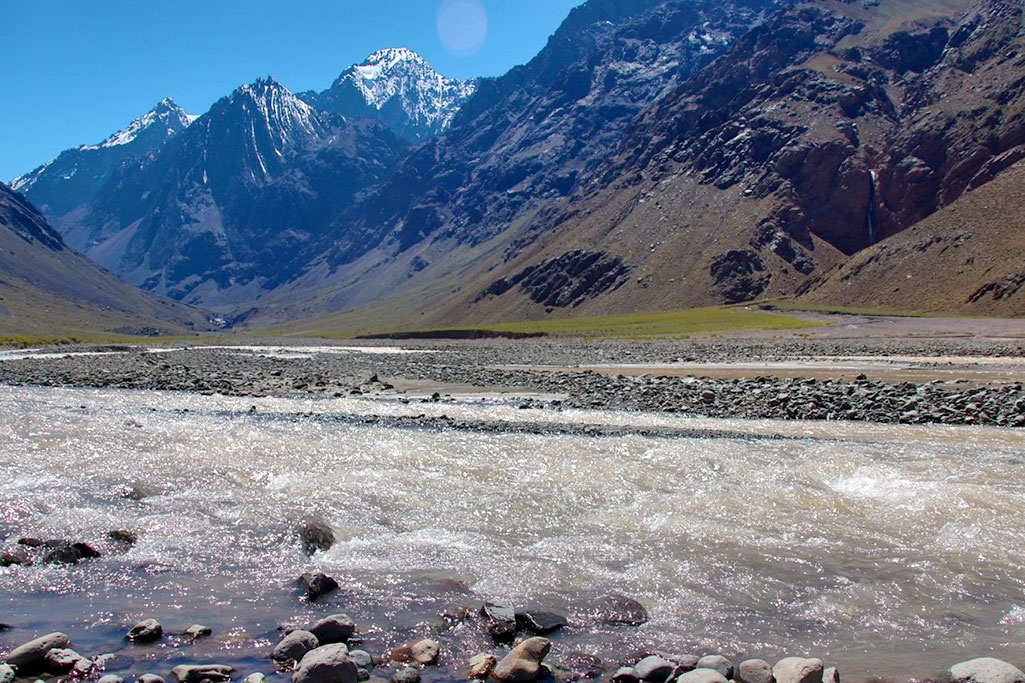 Ya con el cuerpo más recuperado de esas casi 12 h. del día anterior, comencé mi marcha hacia el sector denominado “Las Pircas”, lugar en el cual se debe cruzar el río Olivares. En esta parte, el río se ensancha bastante, lo que lo hace menos profundo. Una vez en Las Pircas, para mi sorpresa, pude cruzar el río sin ningún problema. Era uno de los hitos que debía cumplir según mi planificación y el que me permitiría seguir avanzando. Ya cruzado, seguí mi camino hacia un sector donde, según los registros obtenidos, existían dos lagunas. Ese era el lugar que había decidido ocupar para montar el segundo campamento.